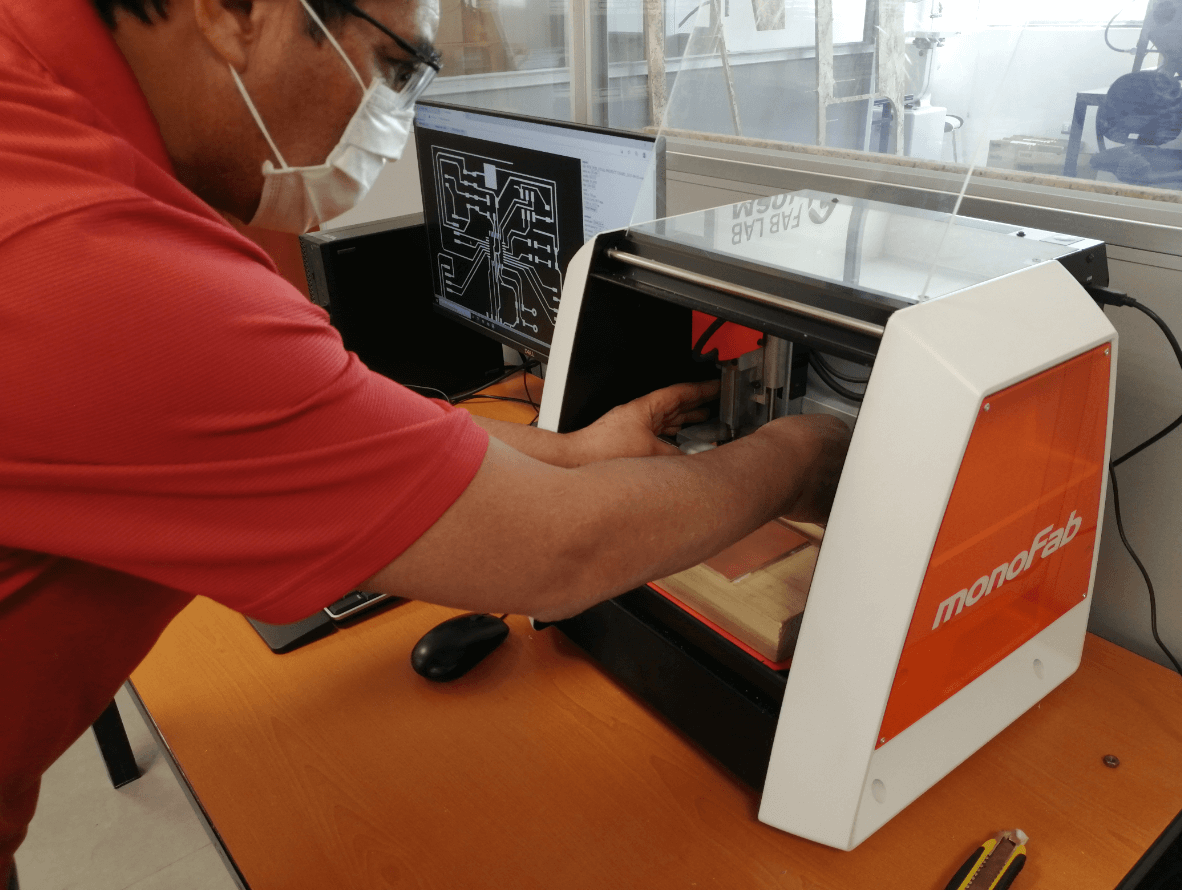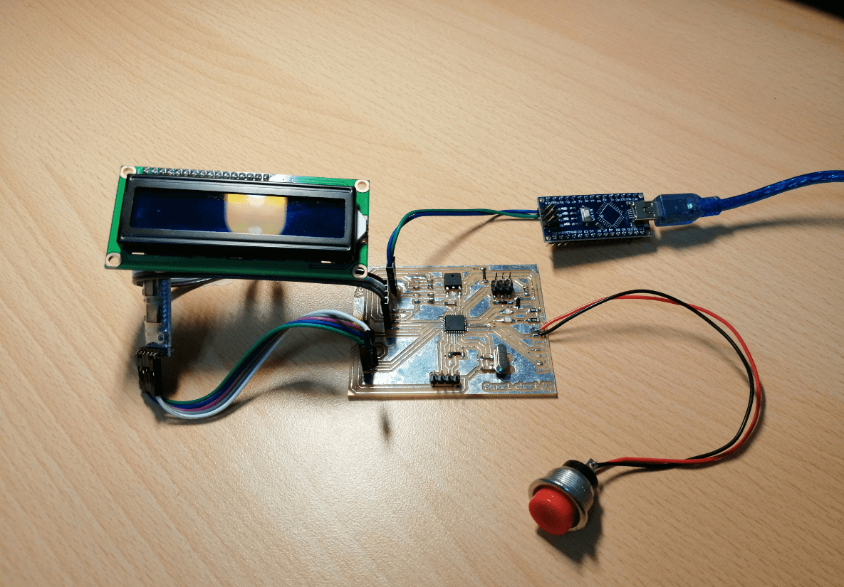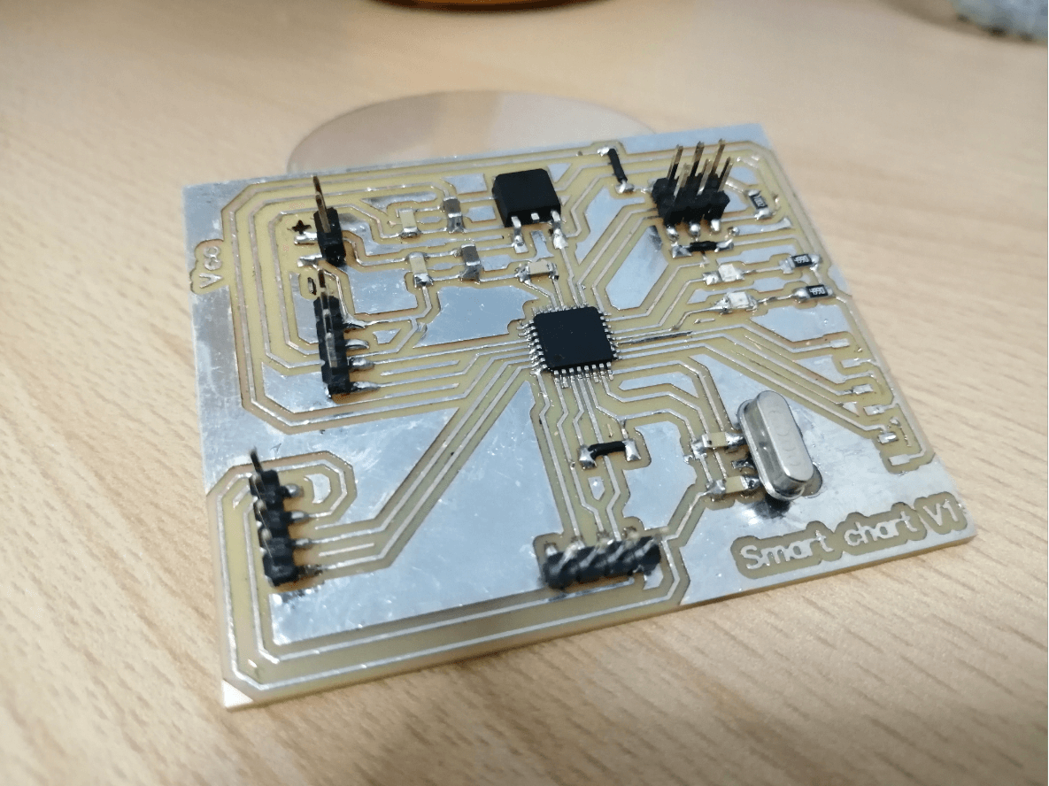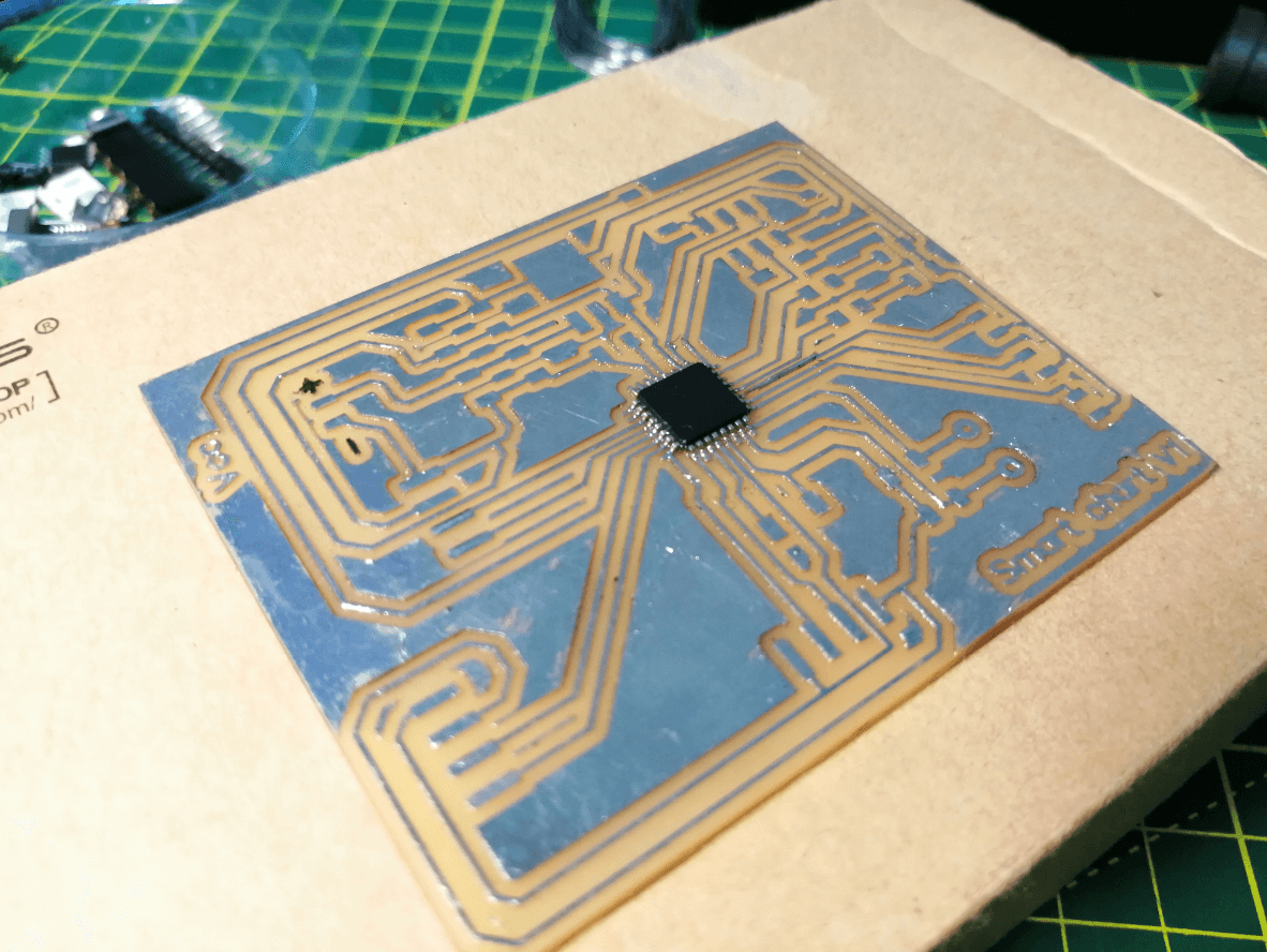 The milling process tested the resolution of our monofab because by using the Atmega328p-au microcontroller some traces were very close, first milling was performed with a 0.001 milling endmill (for super fine finishes), but the result was not the same, expected and added to the fact that our sacrificial bed was not leveled correctly, so it was discarded. Having correctly leveled our sacrificial bed, I decided to modify some tracks to be able to mill with a 1/64 endmill and luckily everything turned out perfect except for the + and - symbols.