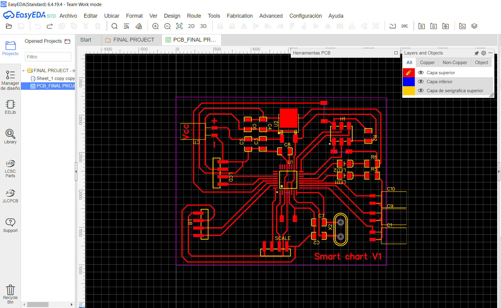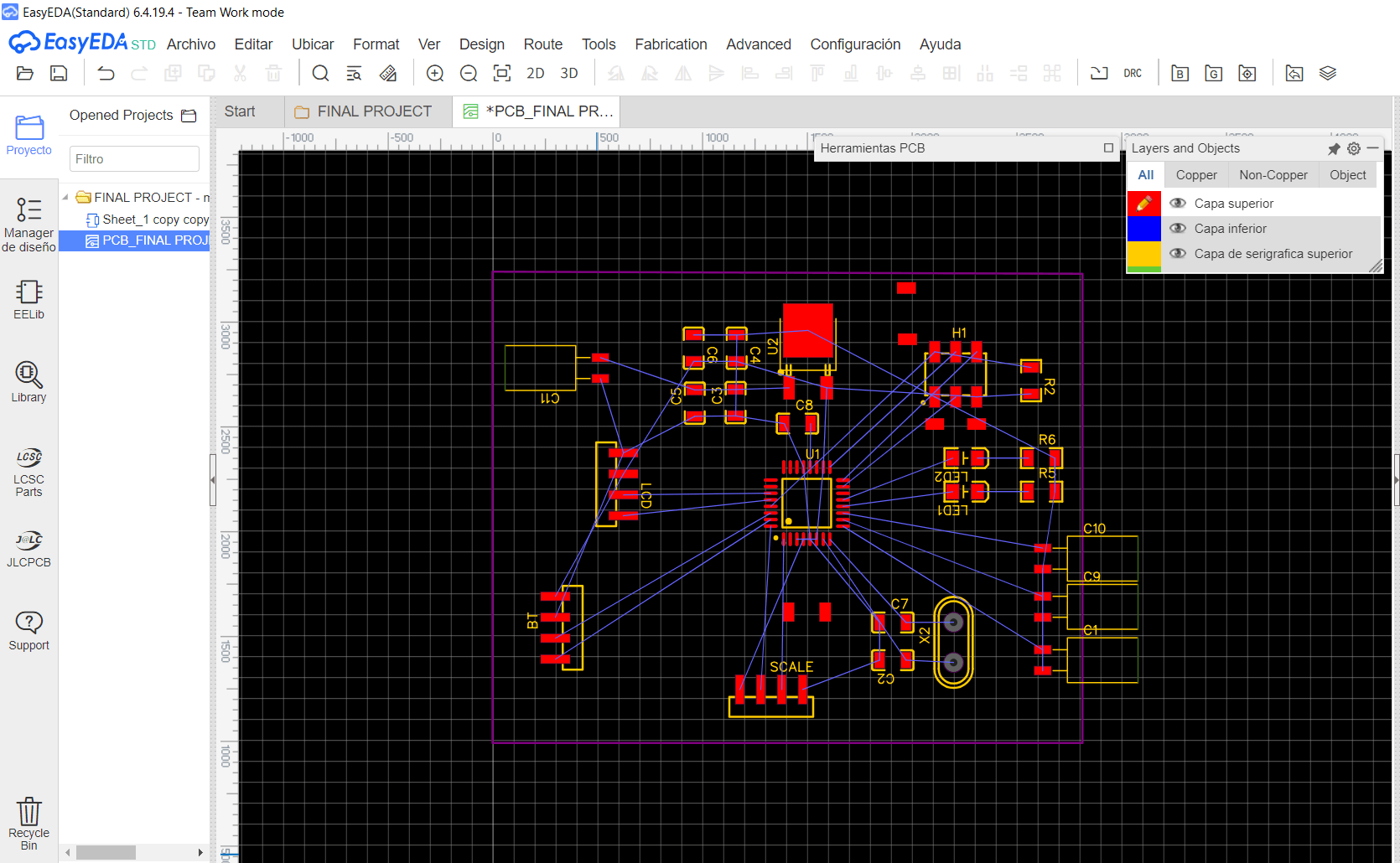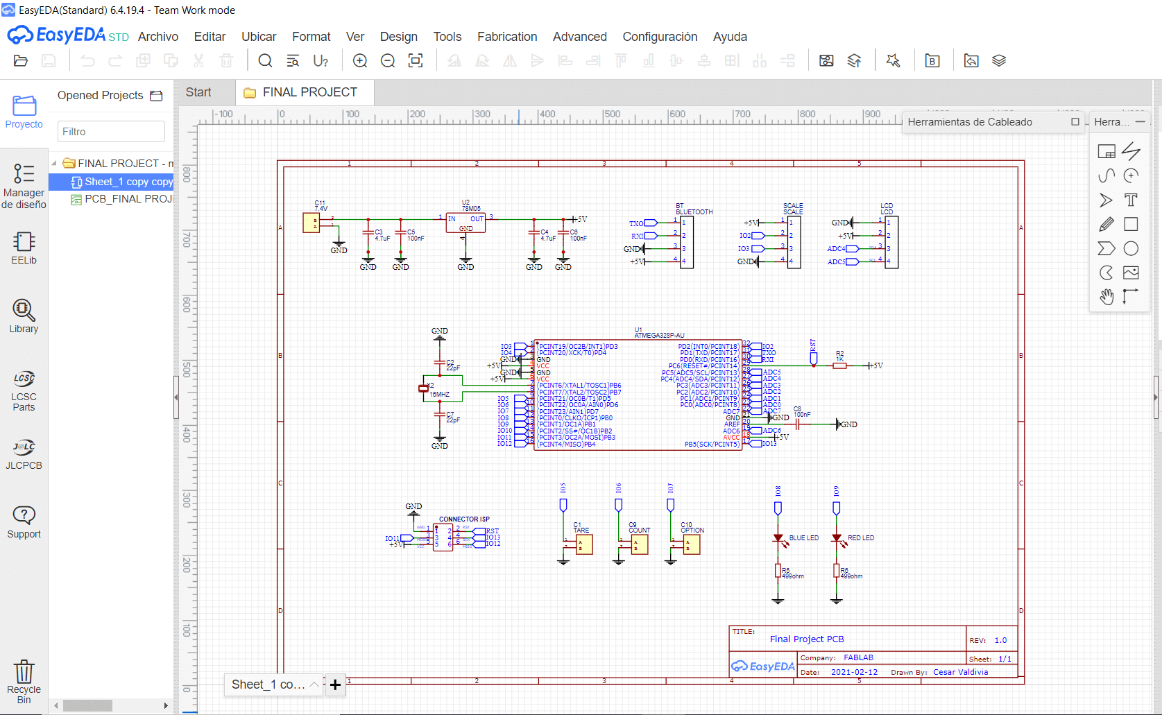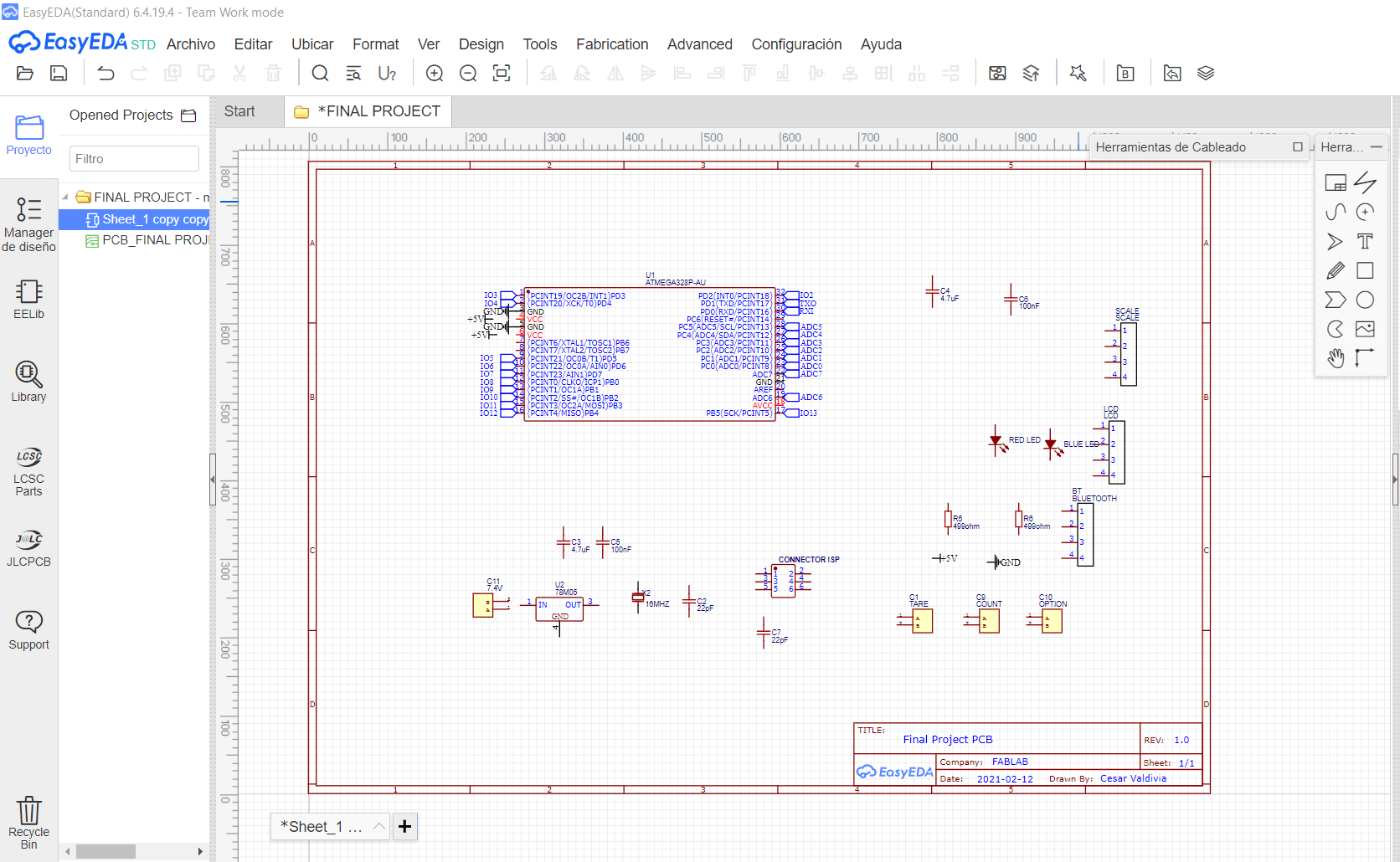Now that everything is taking shape, I can proceed to elaborate the PCB, for this I will use EasyEDA to elaborate my one-sided PCB with SMD components and I will use the Atmega328p-au as a microncontroller due to the number of pins it has and the frequency greater than the one that used before (unlike the ATtiny85), first we must locate all the components that we will use in our worksheet and then make the connection of all the parts that we will use.
