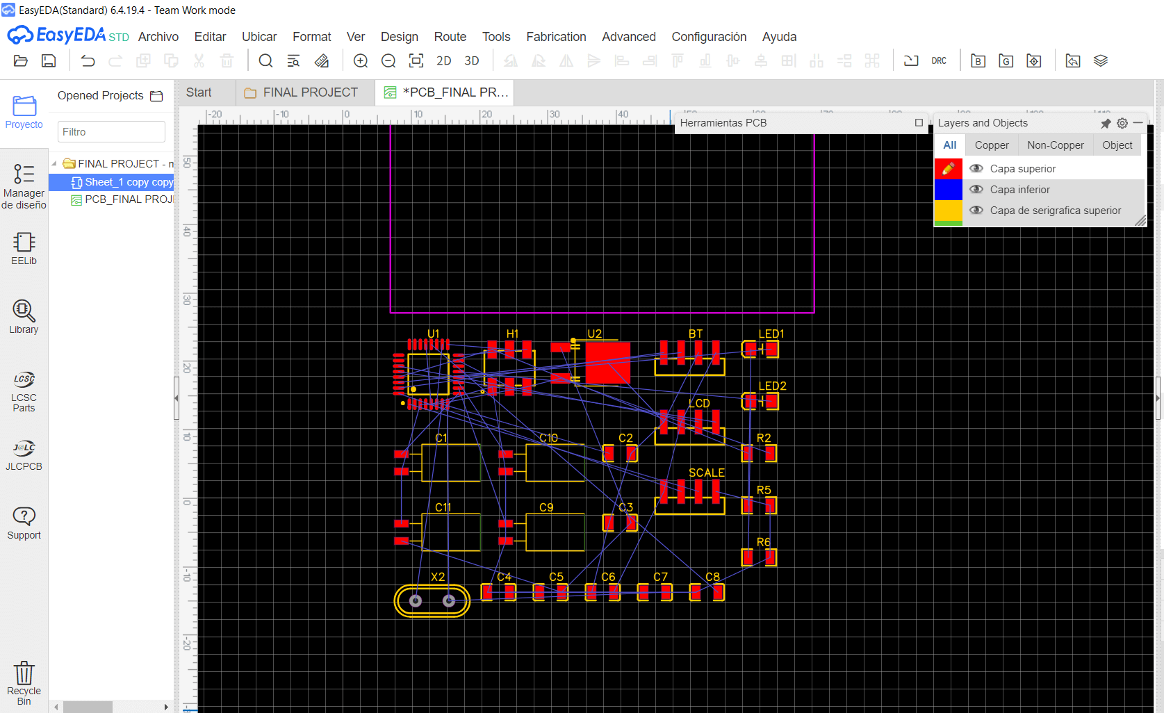 Next we can proceed to elaborate the PCB itself, by default the components will appear located in no specific order, so the first task is to locate them in the purple box known as OUTLINE, with all the components located in the location we consider the best, We can start creating the pads to connect each of the components, we can use the blue lines that indicate the beginning and end of each of the connections, I decided to use a pad thickness of 15mil because I plan to use a endmill of 1/64 or 0.4mm diameter, after all that long process I decided to add a little text to point out some important parts and also to name my board.