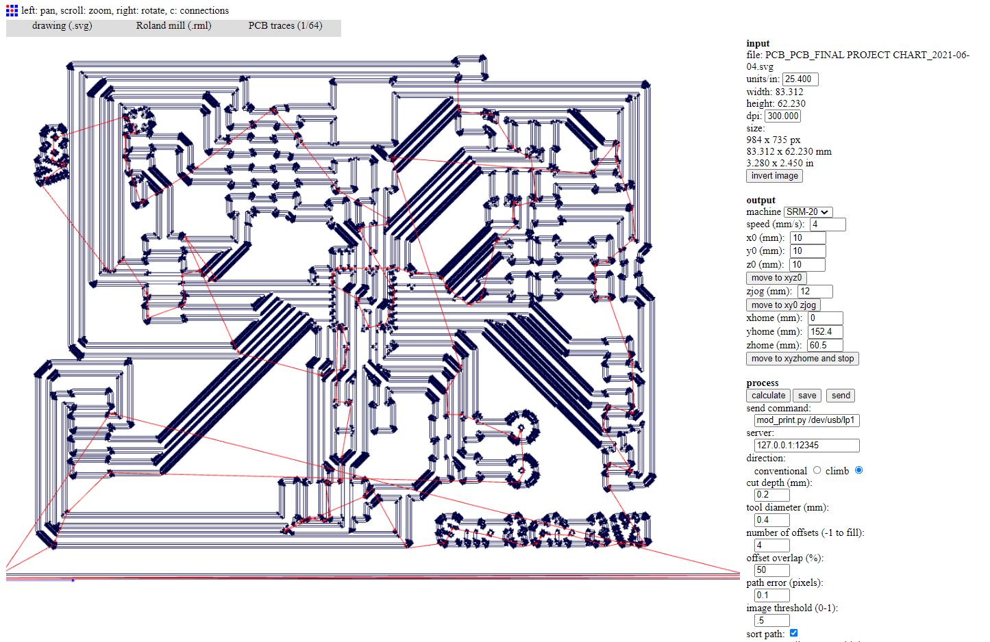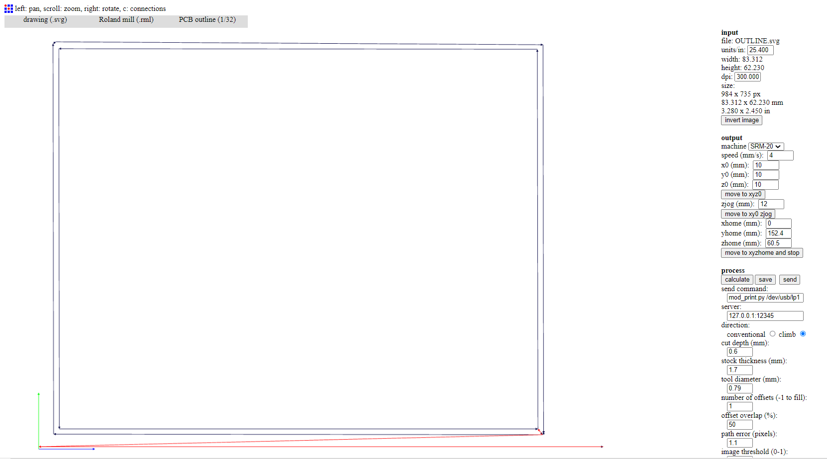I downloaded 2 files, one for the TRACES.svg and one for the OUTLINE.svg, I must enter both files in fabmodules to generate the toolpaths to be able to mill my board, some important parameters: