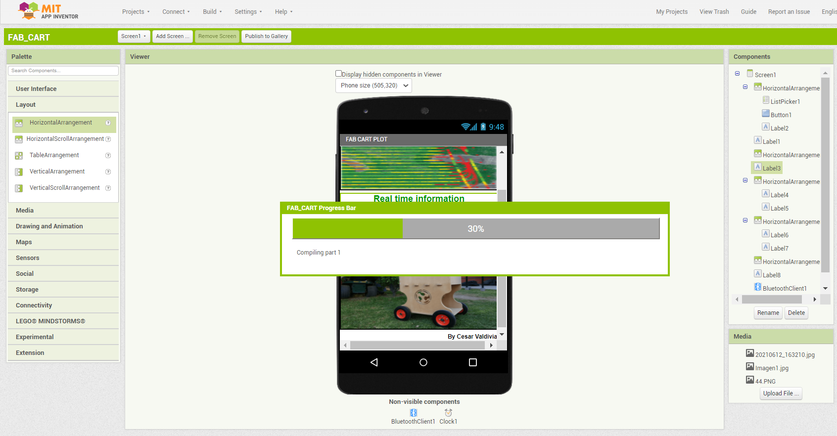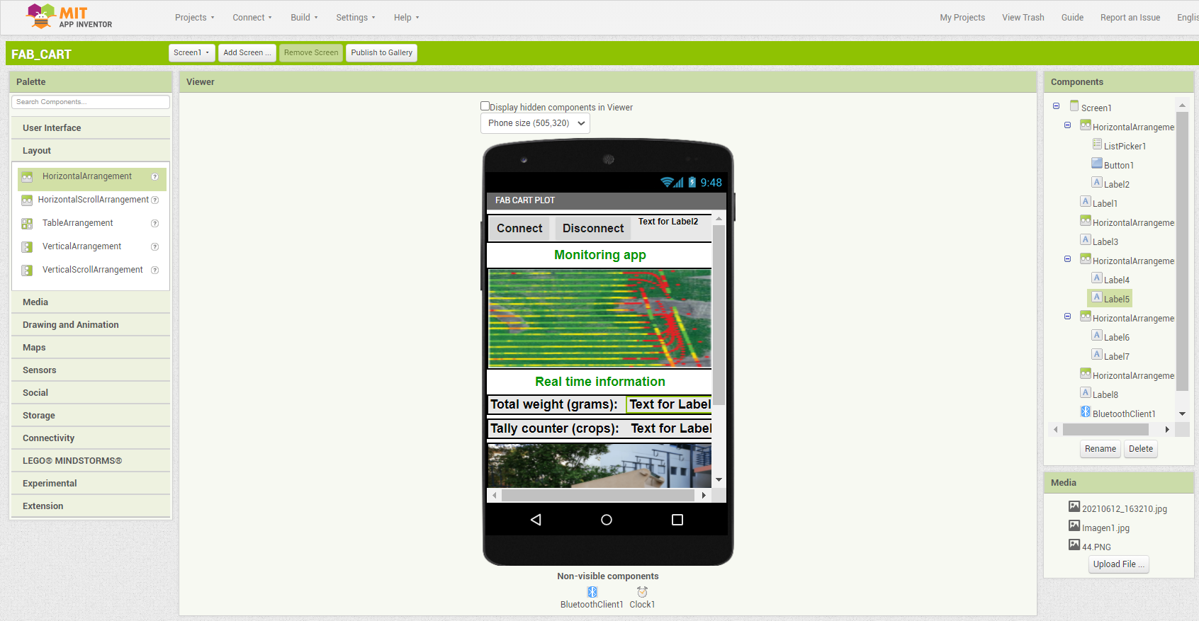 The function of the app is to monitor, at this very early stage and with my limited knowledge of app design, I elaborated a basic app that shows the values in real time, both of the weight and the tally counter, later I would like to load all that information to a server and show a heat map of the areas that have the best production, I decided to simulate that by adding an image in the GUI of a crop and the roads traveled.