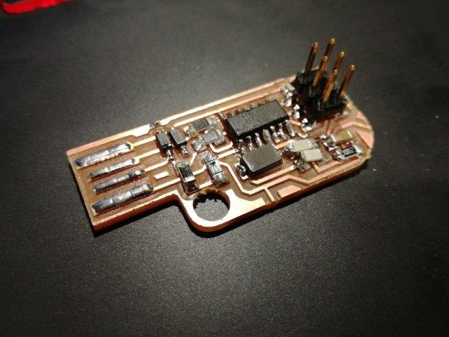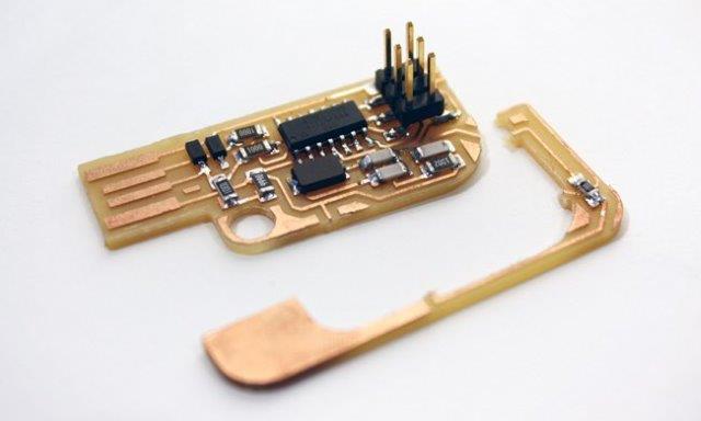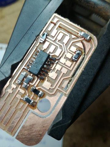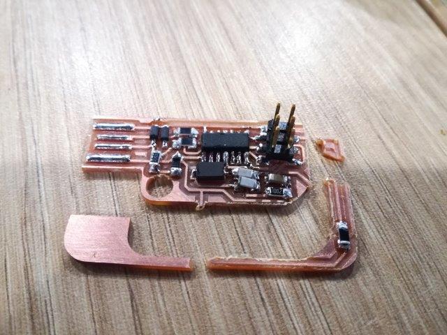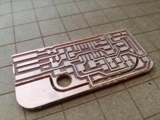 The outline milling is made following the steps, but changing the process (and the bit) to cut out board (1/32), the special thing about this design is that it has a hole for the keychain, and son carved lines to break the board after the programming, cutting put the fuse. The job took around 7 min.