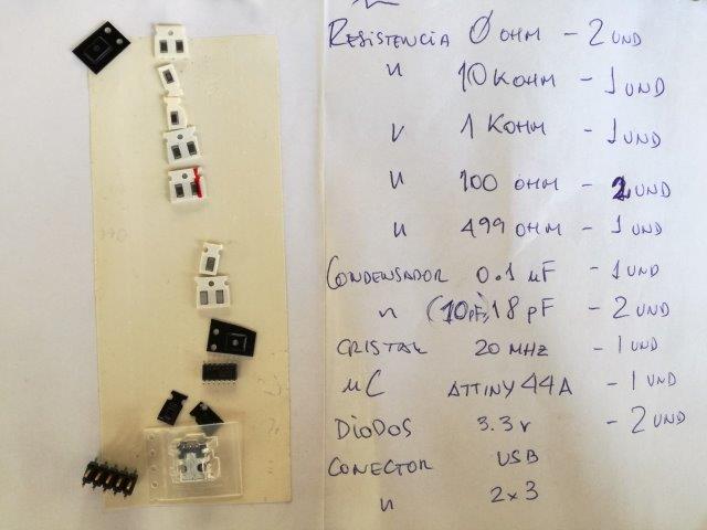 Upon checking the list with the FabLab inventory, the instructor suggested that I could change the 18 pF condensers to 10 pF and still fabricate the board. This is the list with the components attached to double-sided tape.