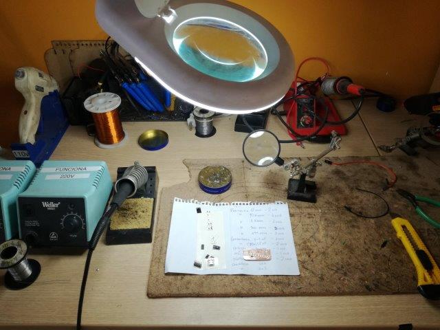 I've never soldered SMD components before so I was kind of worried about how tiny these are. I prepared my soldering materials on the table, this included: a helping hand, lamp, magnifying glass, pliers, cutter, soldering iron and flux.