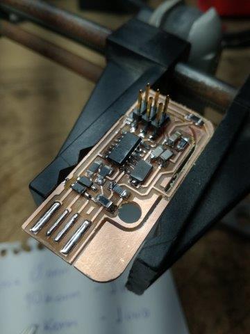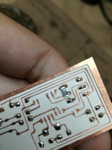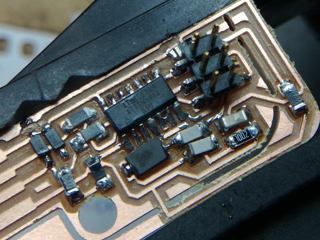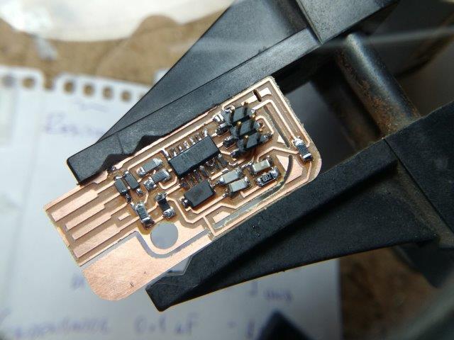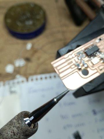 I started with the ATTiny since this is in a central position on the FabISP, and it's supposed the hardest component to solder.
