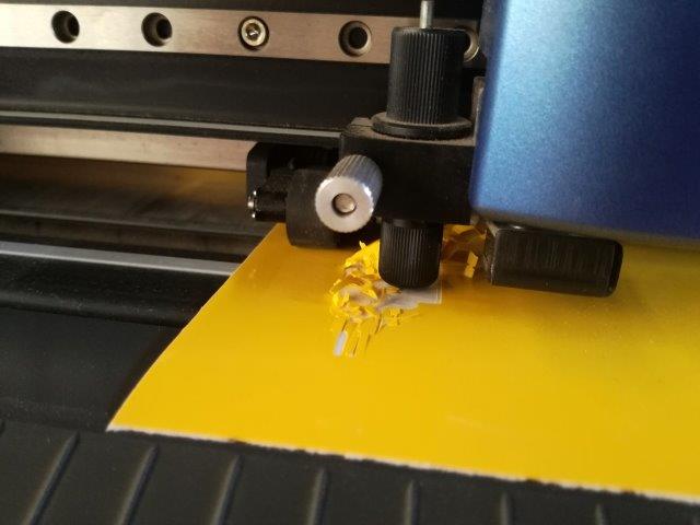 I've bonded the sticky part of the vinyl to the sticky part of a paper transfer sheet, as I noticed this came up too thin for the vinyl cutter, I added layer from the discarded vinyl paperback and glued it together for a triple-layer material. Next to the vinyl cutter, I used the same setting (30 force, 1 speed) to send the job.