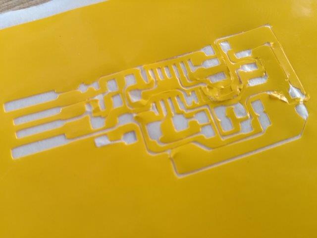 After lifting the traces I noticed that some were too close together, this might indicate that the vinyl slightly moved, or that the traces are too thin for the vinyl cutter (or the material). Strait traces (horizontal and vertical) were clean-cut, but diagonal traces seemed to have issues.