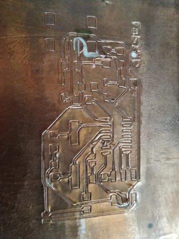 As I was getting a little frustrated with the copper tape, I tried engraving acrylic with the FabISP design, since the engraving creates small canals in the material, this could be used to fill with a conductive material, like solder paste (and later being transformed with the hot air gun) or conductive paint, like doing printmaking.