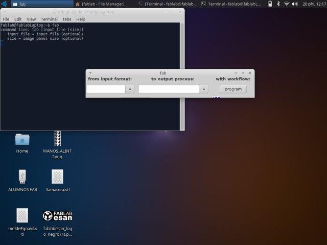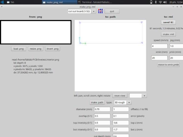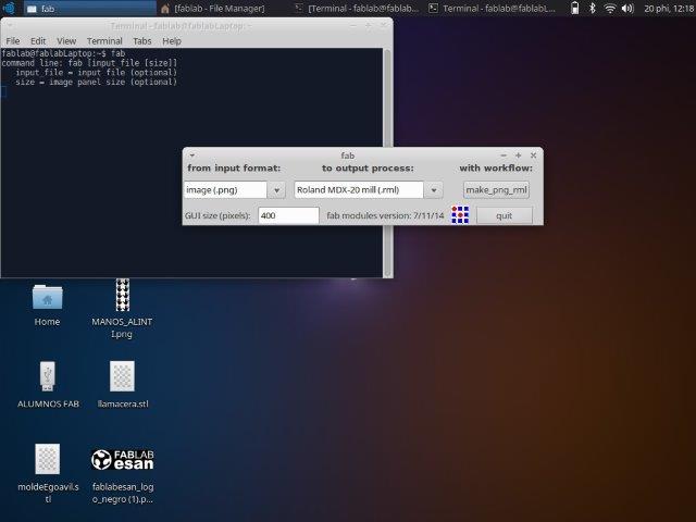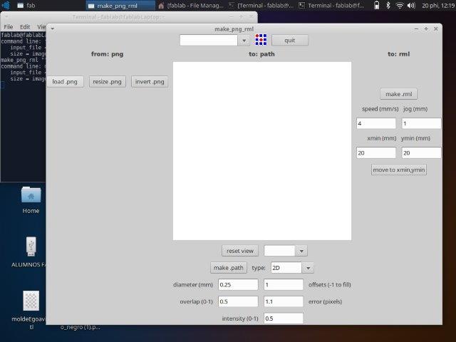 The steps are almost the same as the ones used for the vinyl cutting assignment, we first open the terminal and type sudo fab command to open the application. This opens a small window to select the input format (.png image), the output process (Roland MDX-20 mill (.rml)), and the workflow make_png_rml.