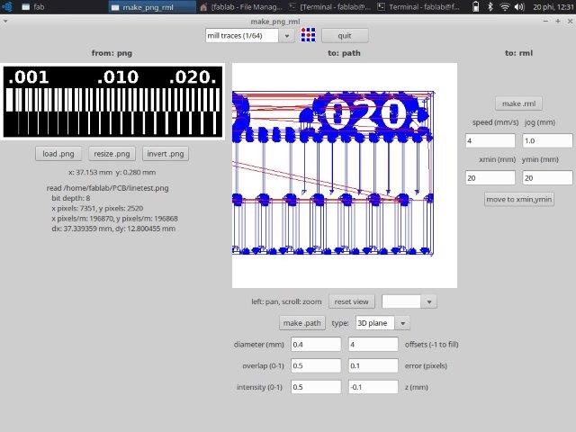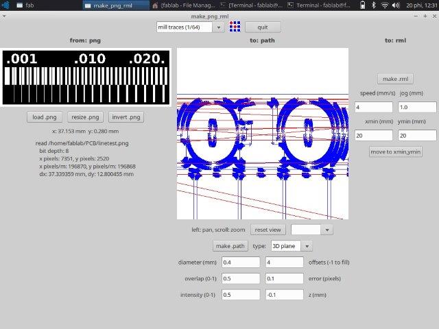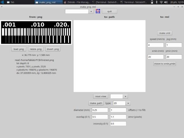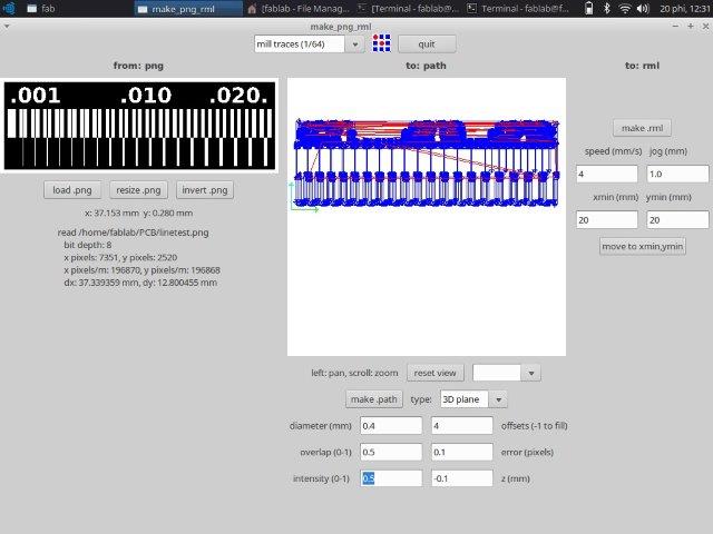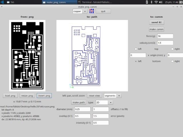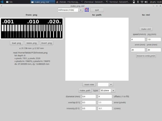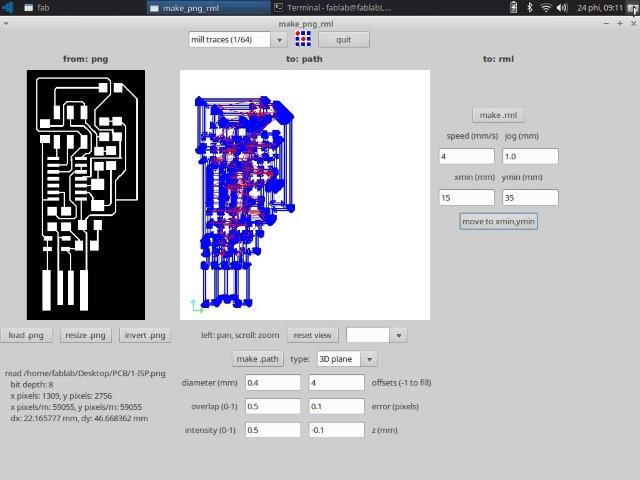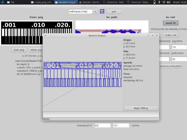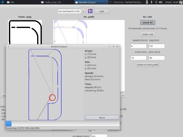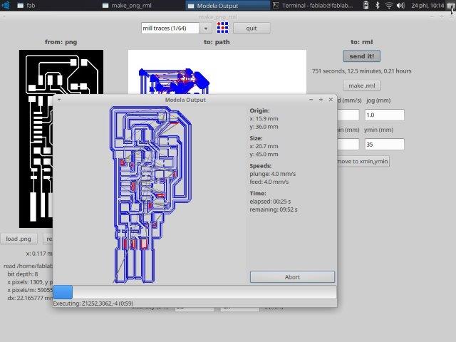 We need to convert the .png templates to a milling pattern so, we used the locally installed mods (for Linux) in the PC next to the milling machine.