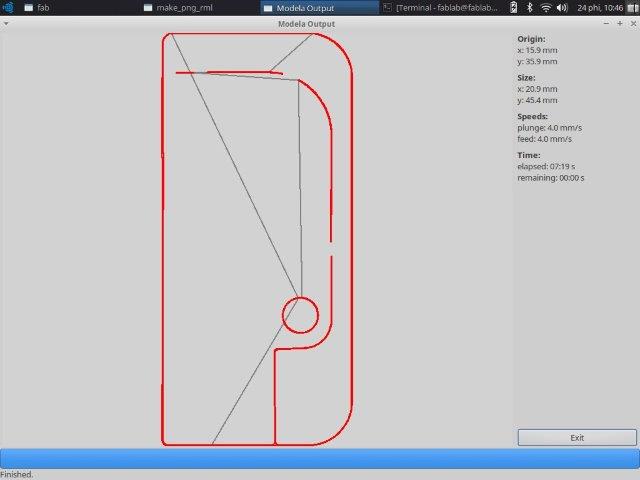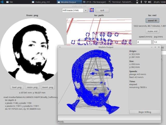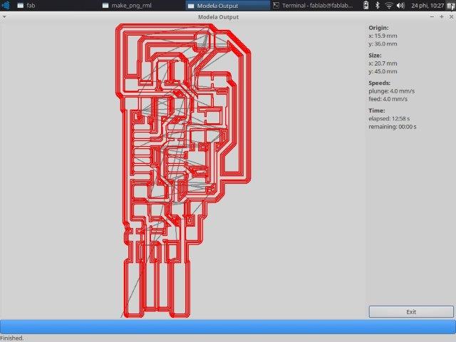 After inspecting the paths we hit the make .rml button to generate the milling file and then click the send it! button to begin the milling work. This last action opens a new window called modela output where we can see the movement of the milling tool, this also gives an estimated time of milling.