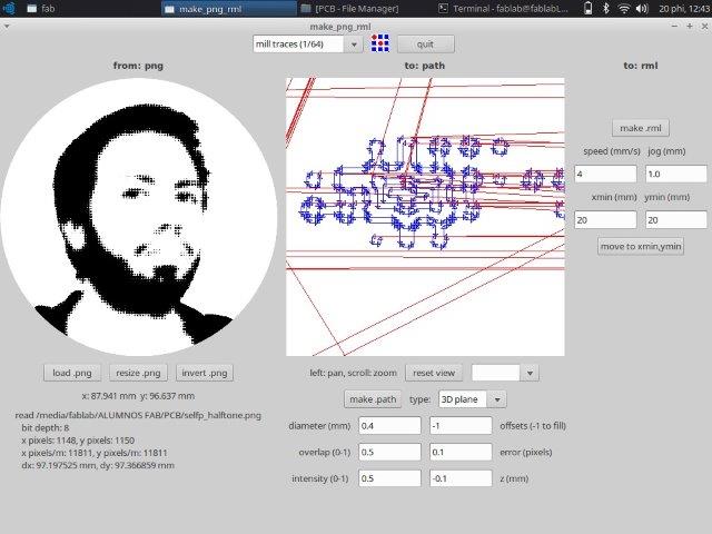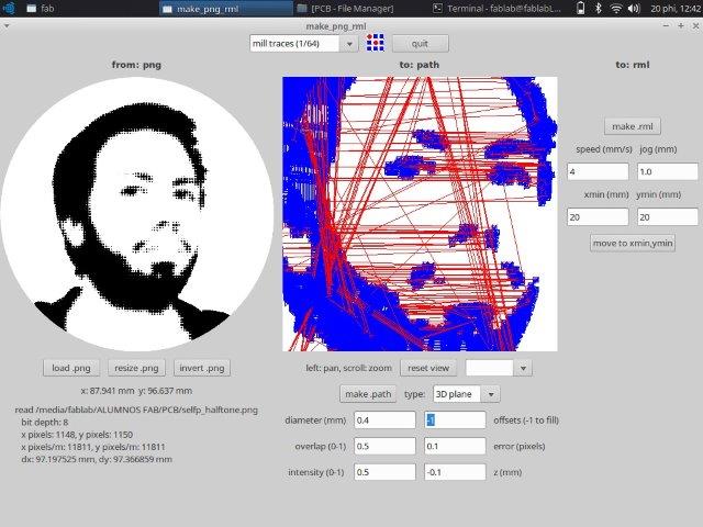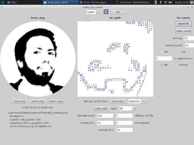 While the offset parameter is useful for PCB milling, to create a replica of a drawing we'll need to use the fill option, to completely remove the material, typing -1 on the offsets box. I used a self-portrait halftone image to test this feature.