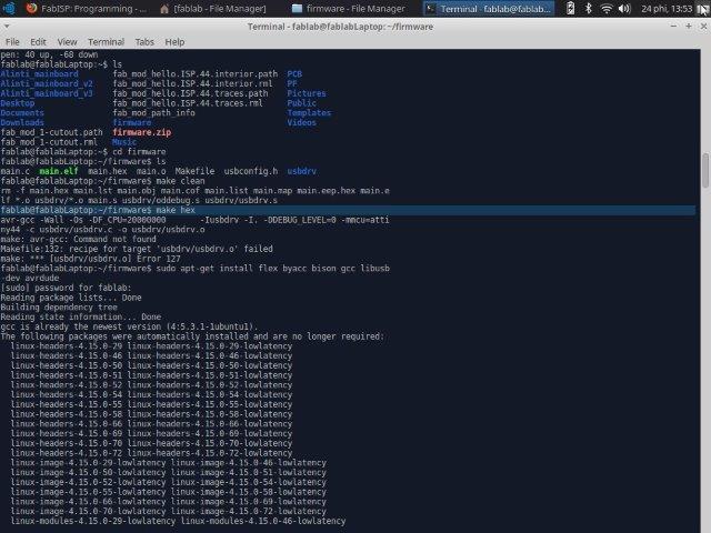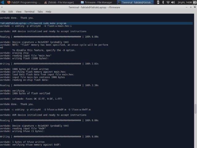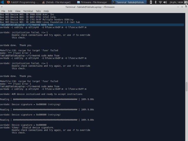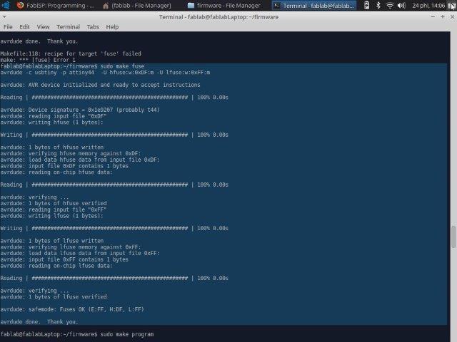 After making sure the FabISP was making enough contact with the USB port the make fuse went right.