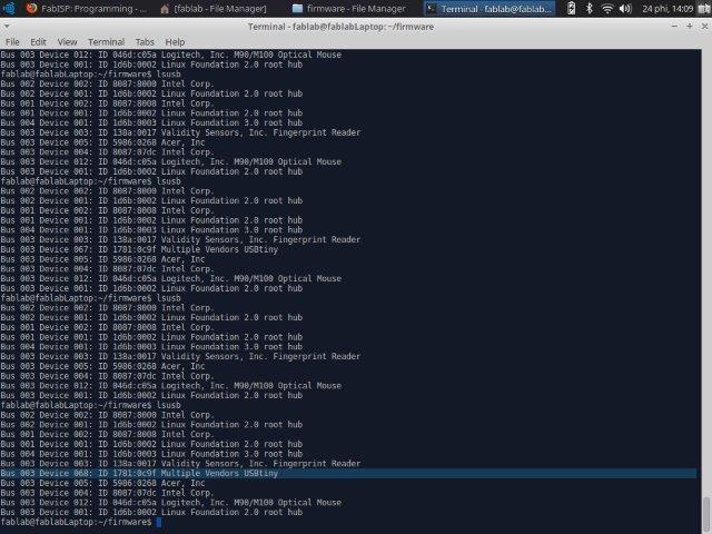 Success! the images above show the correct programming of the FabISP and the USB port detecting the device (command lsusb). The device is also detected by my Windows PC.