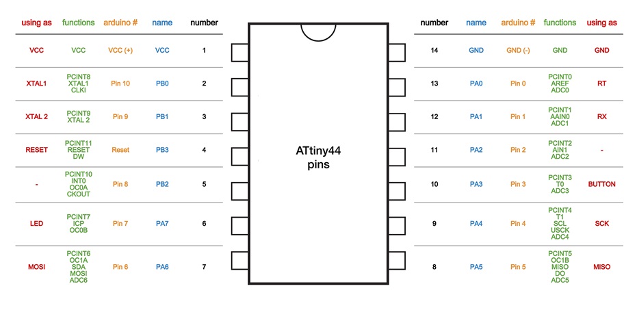 - ATTinny44 microcontroller: This high performance, low power AVR 8-bit microcontroller is perfect for simple boards. The CPU must be able to access memories, perform calculations, control peripherals, and handle interrupts. The on chip ISP Flash allows the Program memory to be re-programmed in-system through an SPI serial interface most commonly.
