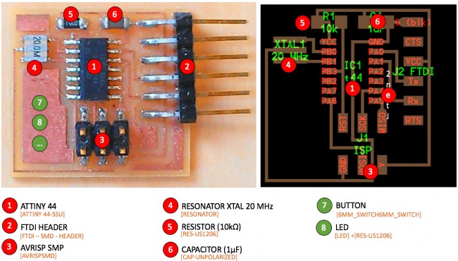 This board uses an ATTiny44 microcontroller, an FTDI connector, a 6-pin ISP Header, two 10kohms resistors, a 20MHz resonator and a capacitor 1uF . I’ve also put a button and an LED to program the board that ‘s why i added a 499 ohm resistor