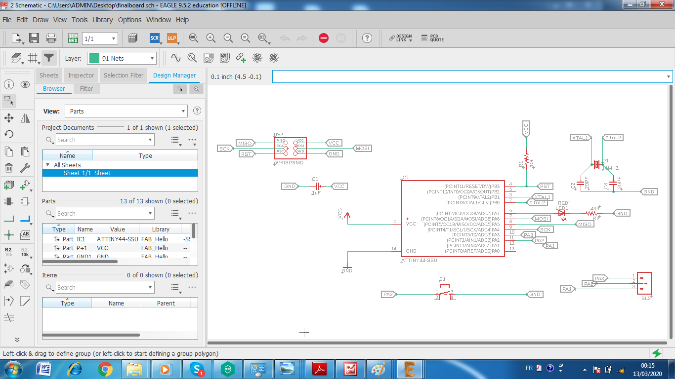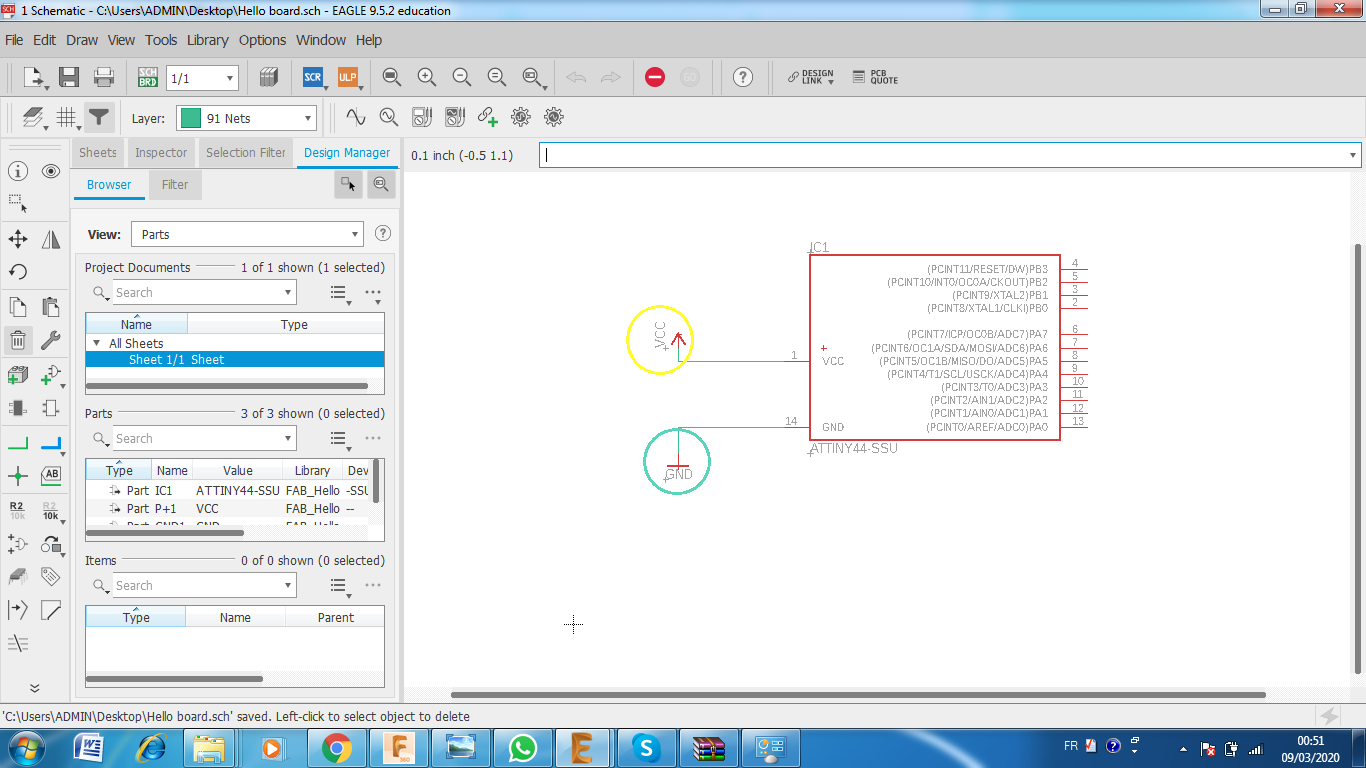 After downloading the library , you need to open both ‘Schematic’ and ‘Board’ windows on Eagle to work on. Then search and place the components on ‘schematics’