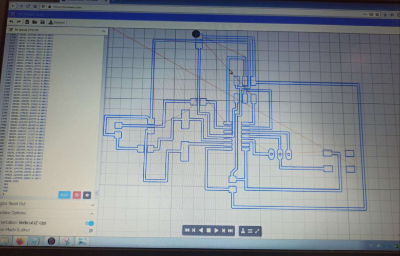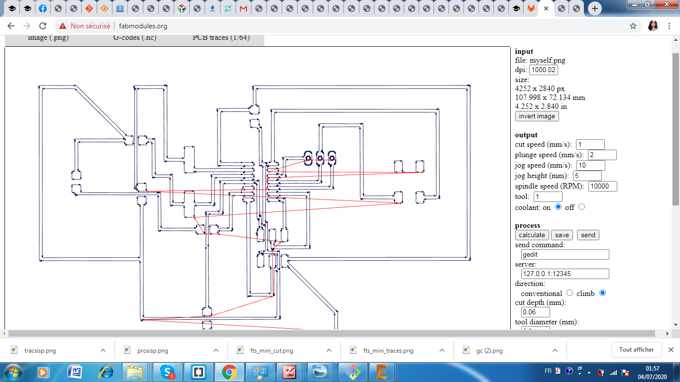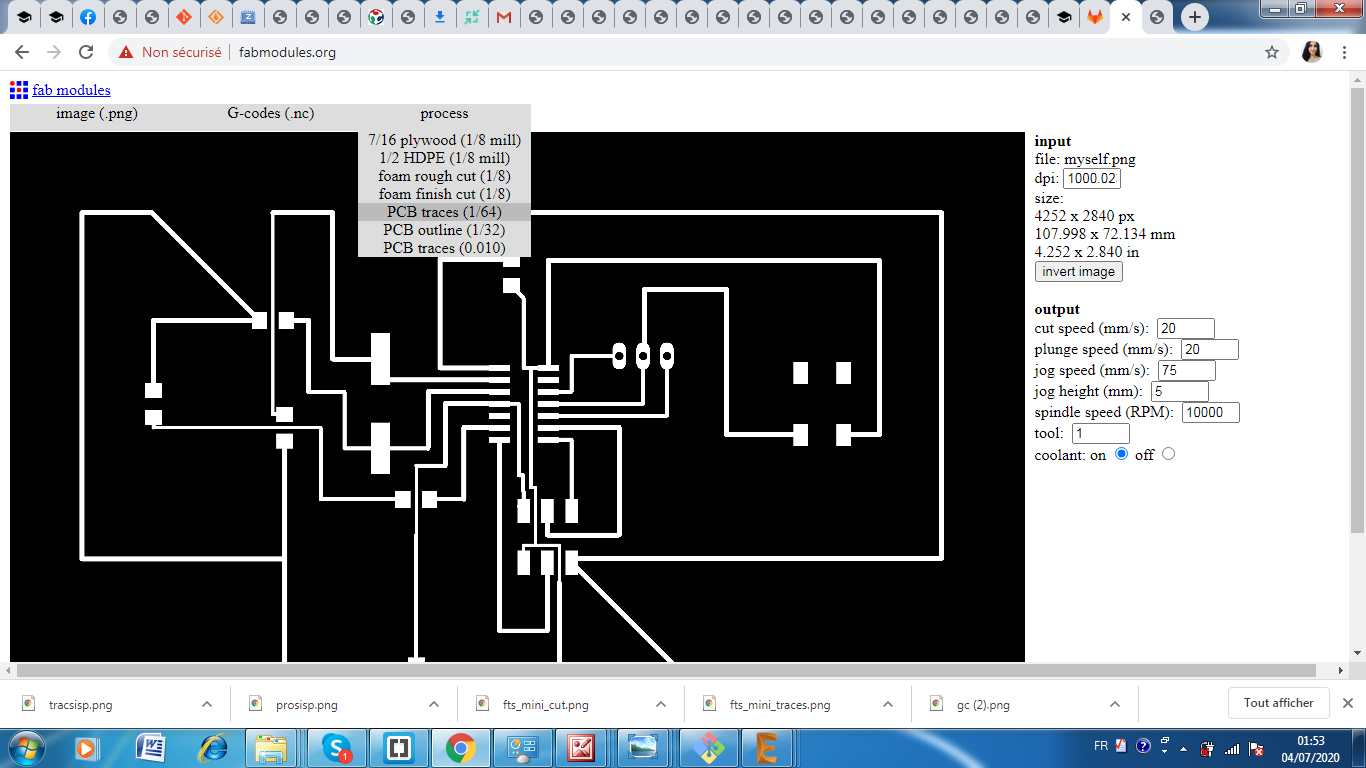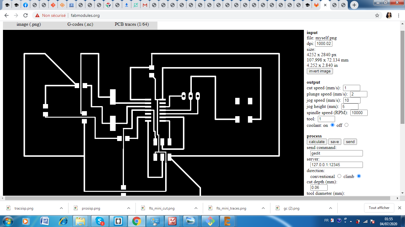 I used Fabmodules online at FabModules to upload the .png images successively and to generate the G-code for the CNC mill to mill the traces and to mill the outline shape of the PCB.