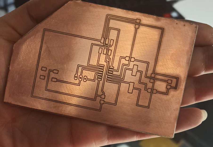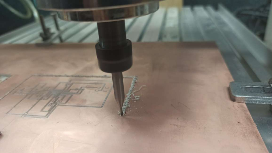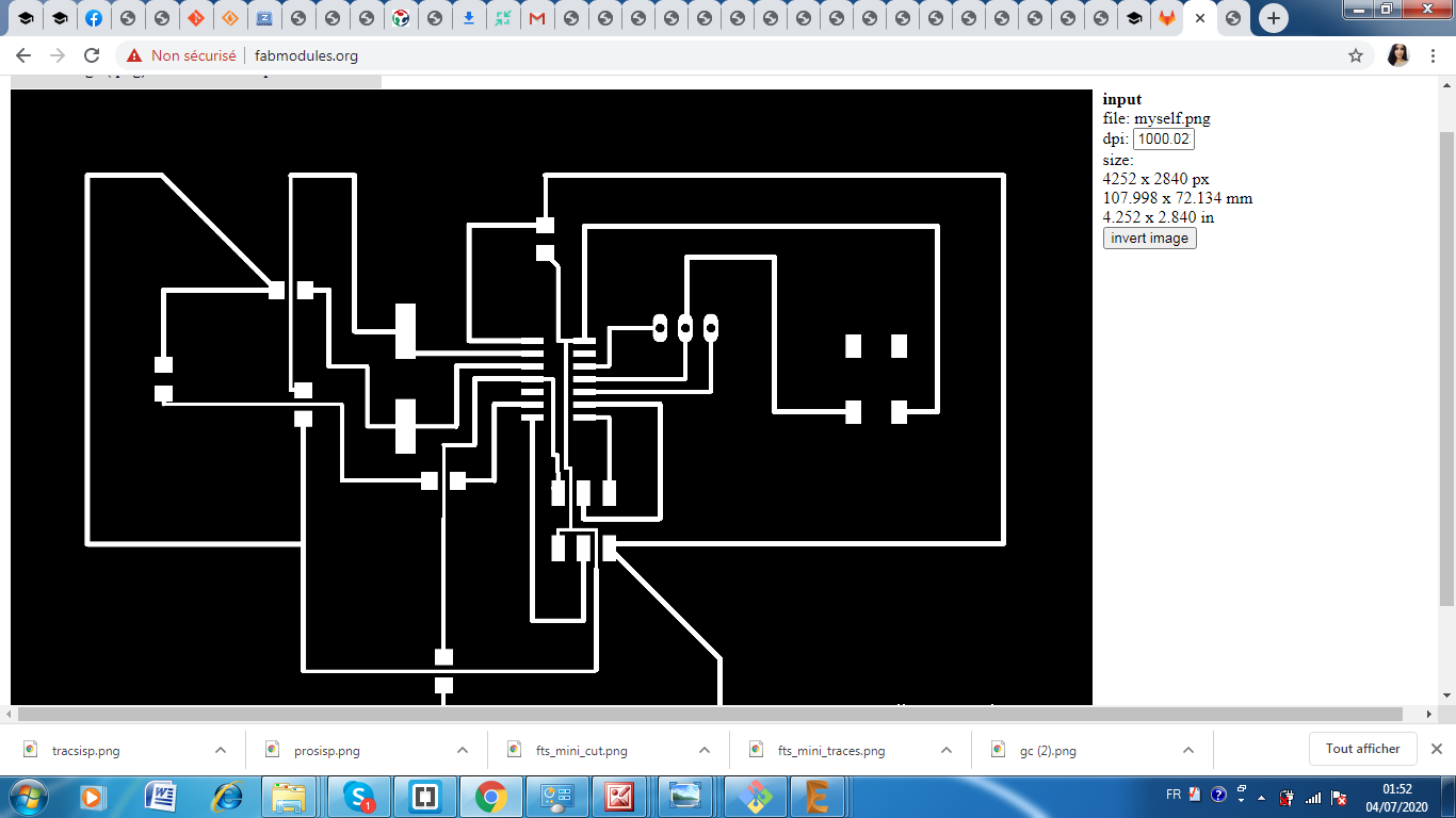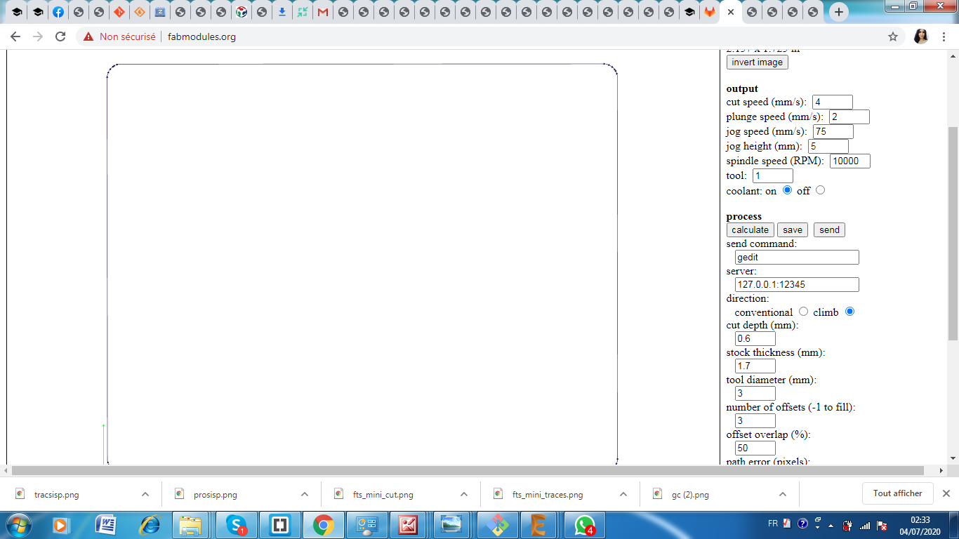 I used Fabmodules online at FabModules to upload the .png images successively and to generate the G-code for the CNC mill to mill the traces and to mill the outline shape of the PCB.