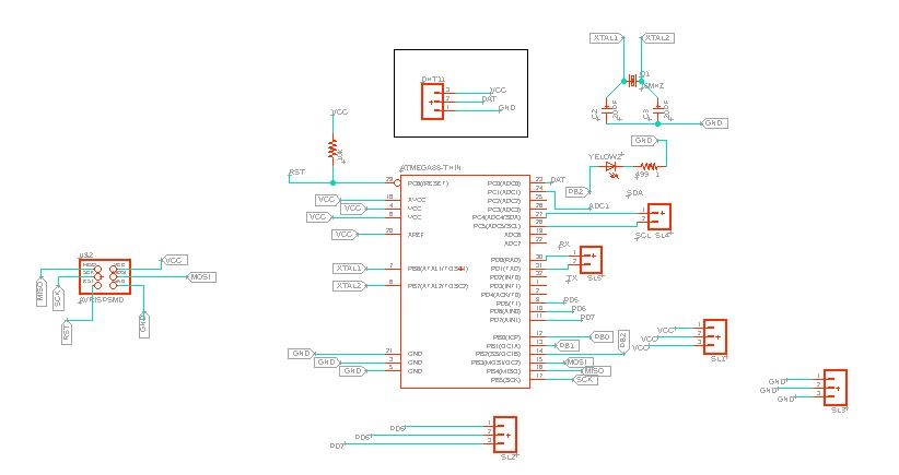 Now it i time to make my own board for the input week . I will test the DHT using this board so in Eagle i made the schematic and i used the atmega328p microcontroller . At first i was thinking of using an attiny 44 microcontroller but as smd i only found the atmega328p available in my country . I connected the DHT 11 using three pins the VCC the GND and the Data pin which is connected to the analog pin A0 of the microcontroller .The other components are almost the same components i used to make my hello board in week 7