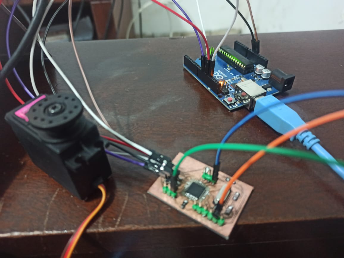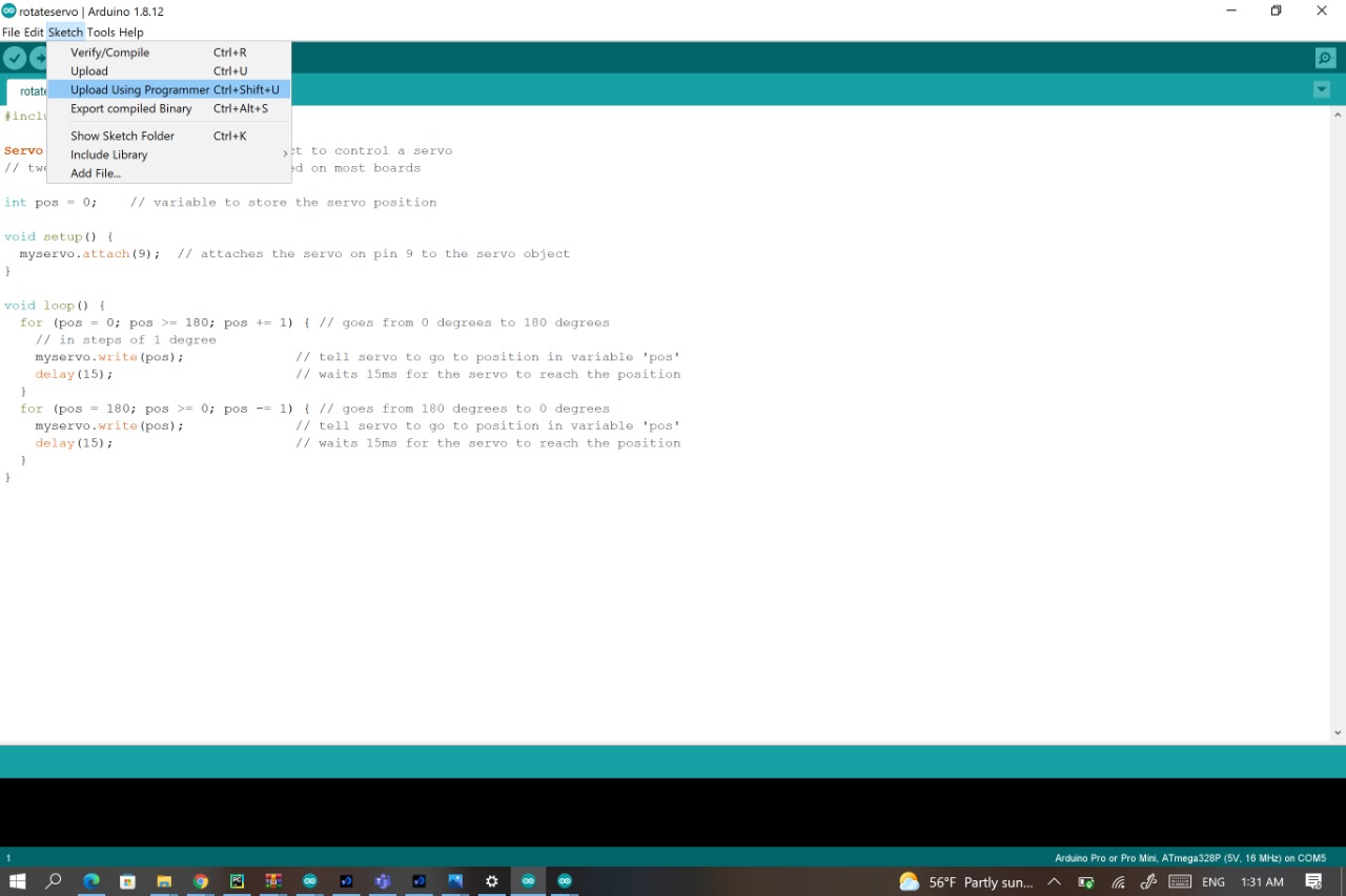 Now to download the servo code to the board :sketch -> upload using programmer and the servo will rotate