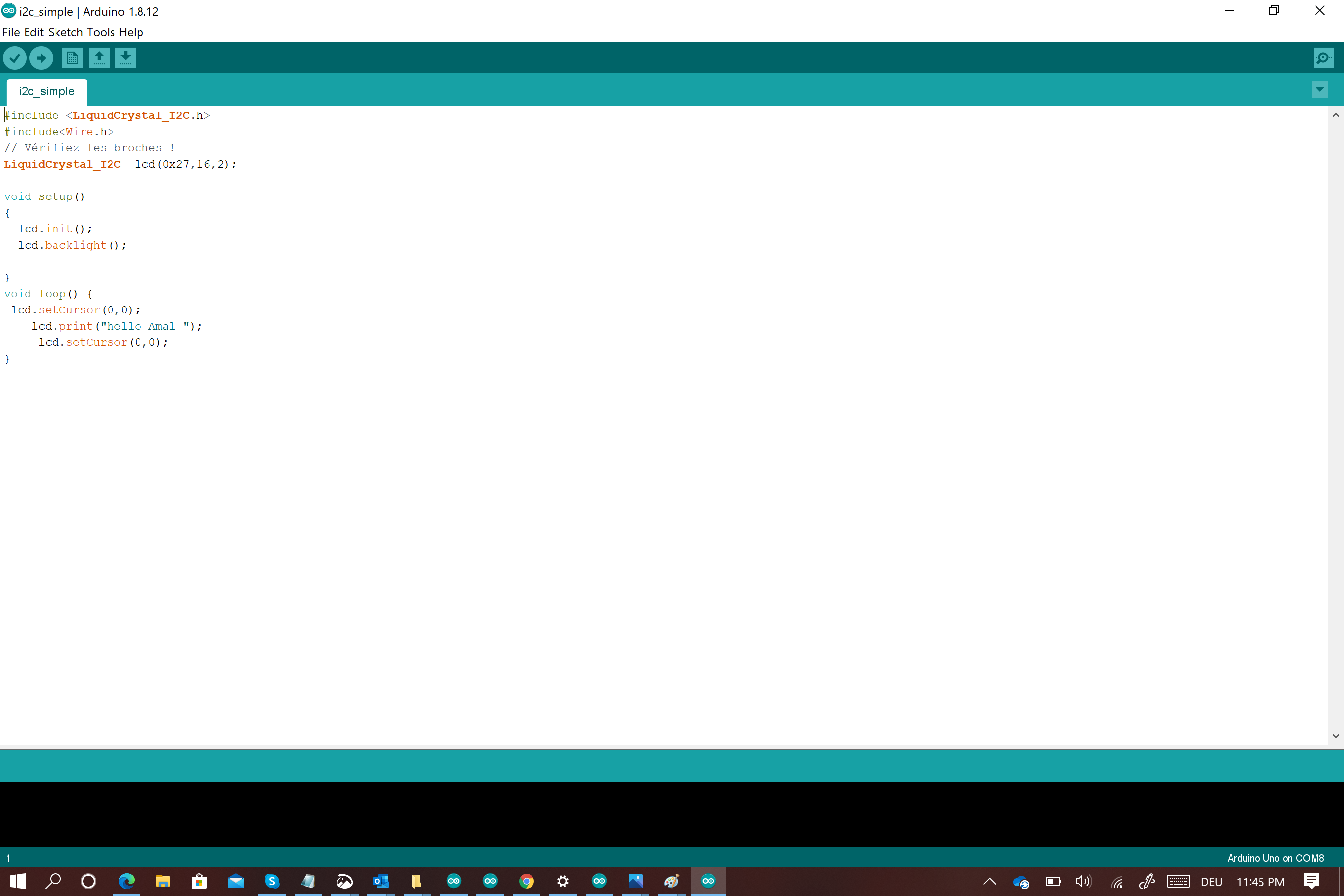 Then i used a very simple code just to make sure that thr LCD is showing Data and the contrast is well adjusted