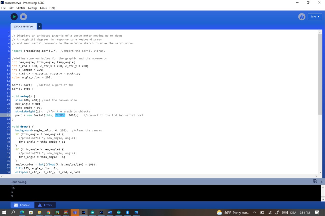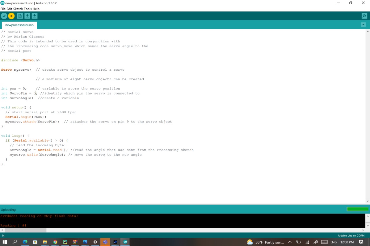 Then run the Processing sketch in Processing. Check to be sure the Processing code is using the same COM port as the Arduino is connected to on your computer. i my case it is COM5 .When the Processing sketch runs, that should display the Processin canvas with the graphic on it. Now press the ‘u’ or the ‘d’ keys on the computer keyboard and the graphic should animate and the servo motor should move as in the video above
