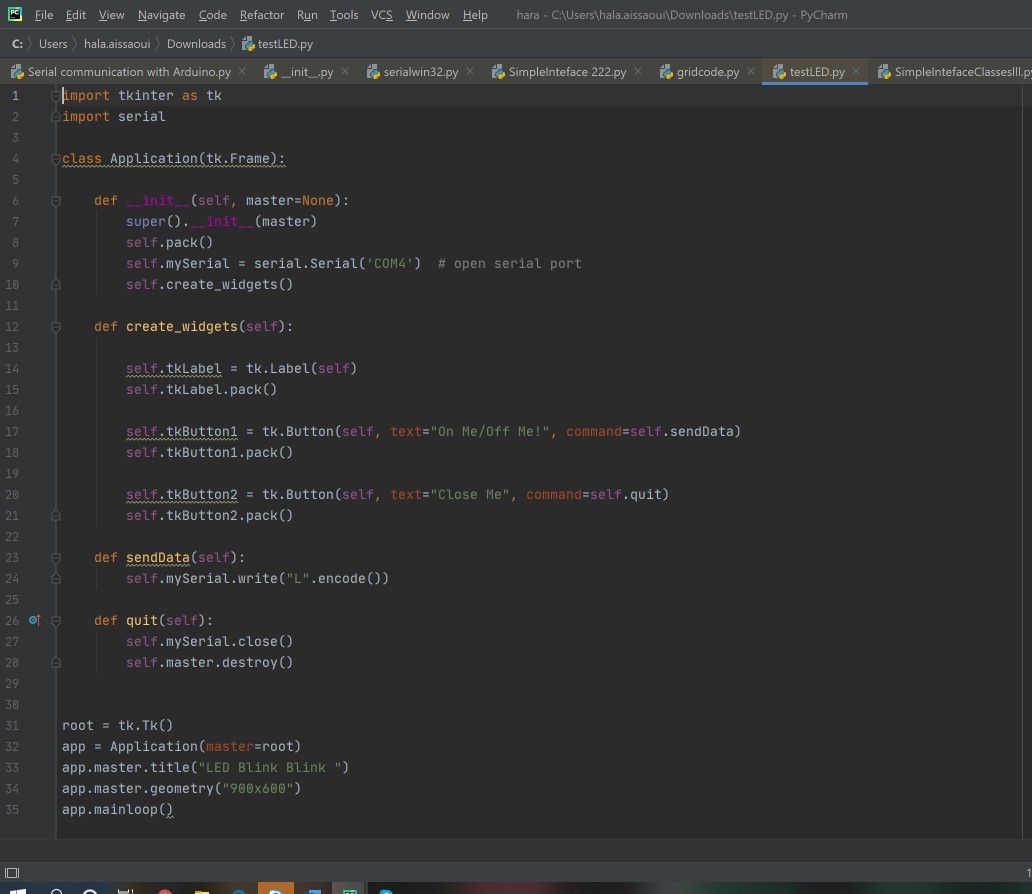 I started by using an LED to create an interfae to put it “on” and “off” by sending a data to the arduino while typing a charachter (“L”)