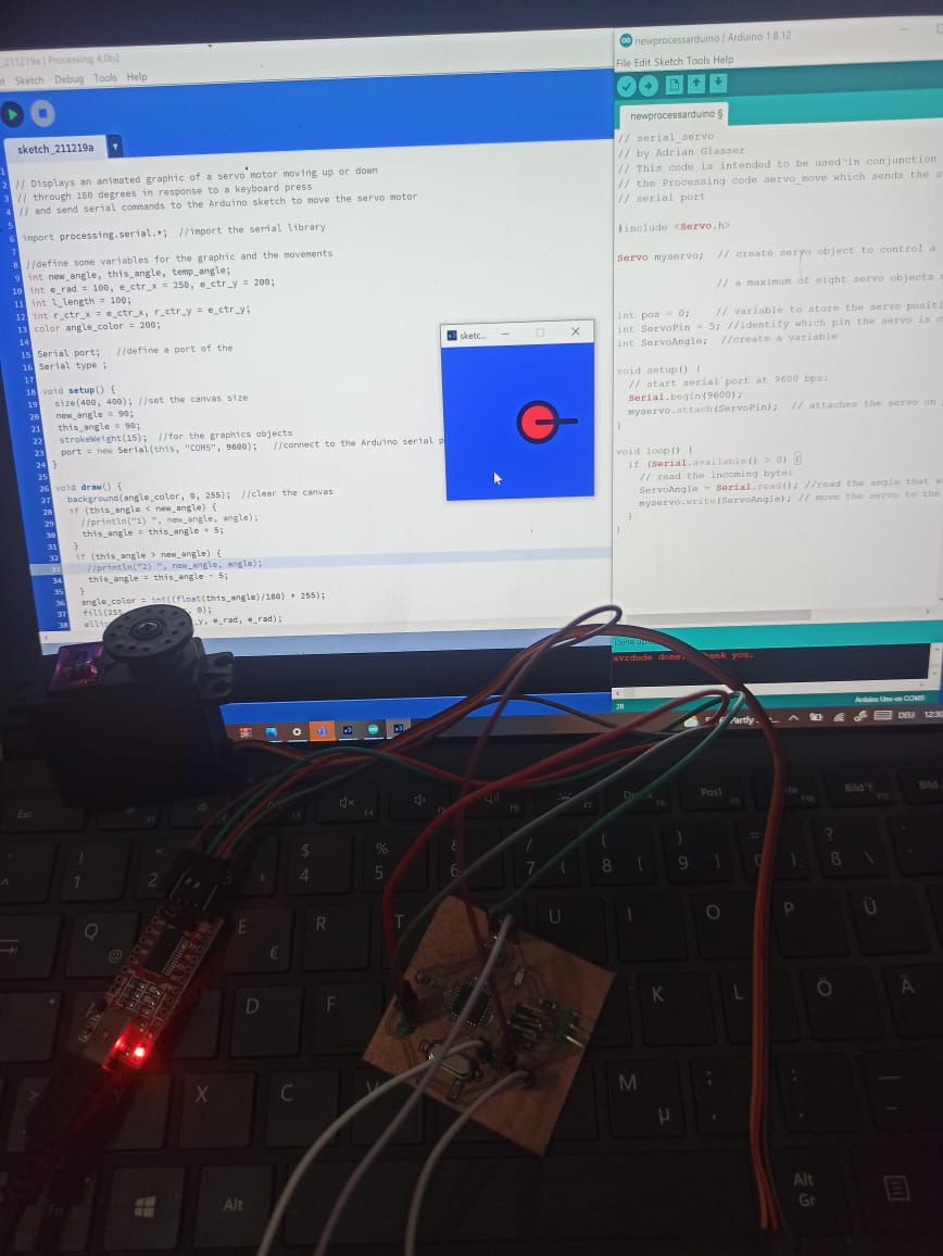 Firt Upload the Arduino sketch to the Arduino Uno. Once that is done, the sketch starts running on the Arduino. Then run the Processing sketch in Processing. Check to be sure the Processing code is using the same COM port as the Arduino is connected to on your computer. When the Processing sketch runs, that should display the Processing canvas with the graphic on it. Now press the ‘u’ or the ‘d’ keys on the computer keyboard and the graphic should animate and the servo motor should move as in the video above
