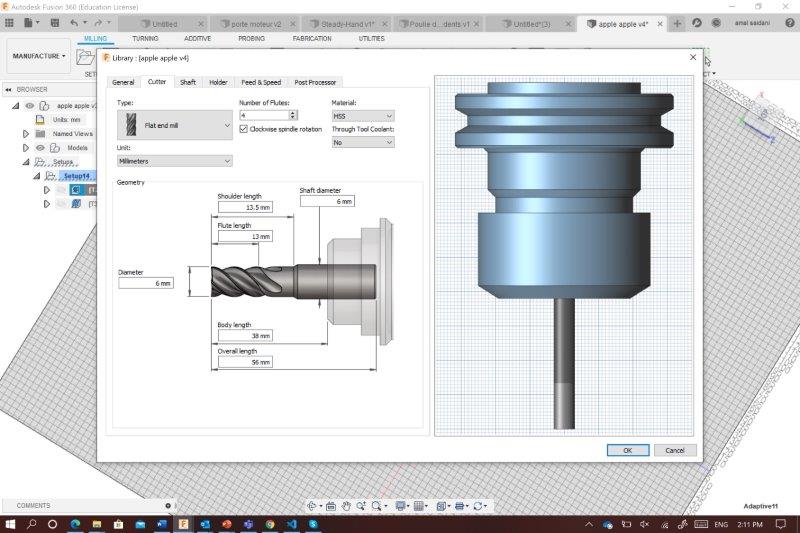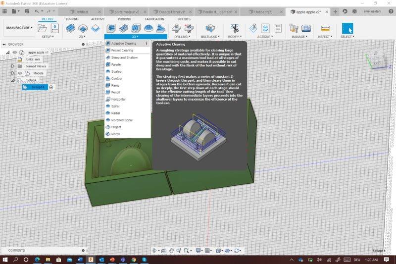 To define the rough cut i used the adaptive clearing option and i choose the right tool(6mm diametre) as showing bellow