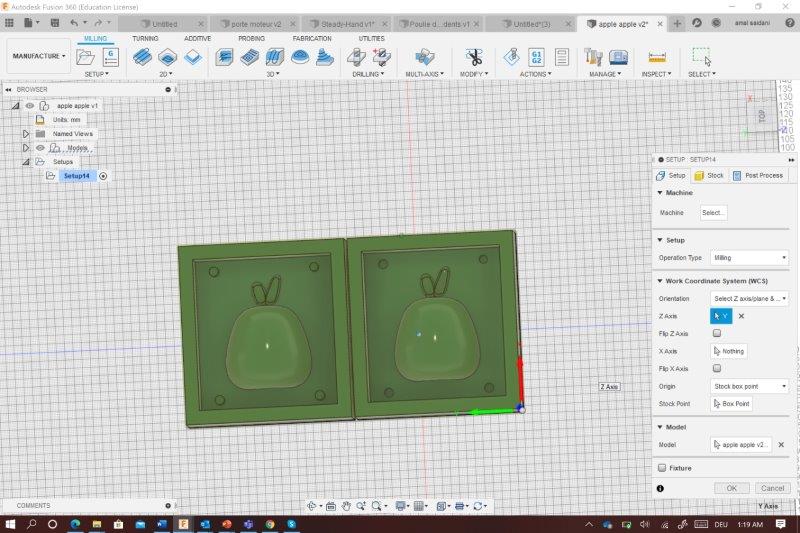 to create toolpaths ,i crated a new setup and i started ajusting my parametres . First i fixed the X,Y,Z axes and the origin . Then i selected the model and it’s geometry as showing bellow .
