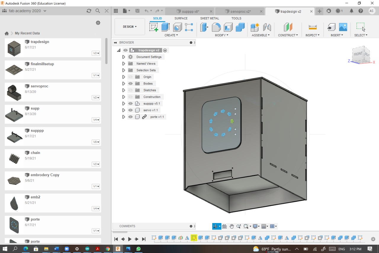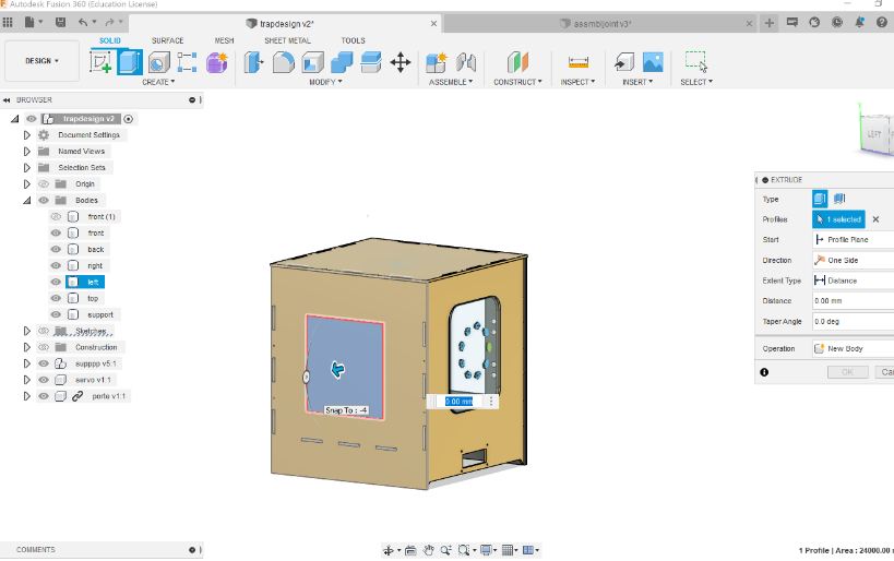 The laser cutting was the process i used to manifacture the door of the trap and the sides as showing bellow.The material I used was the plexiglass 4mm.