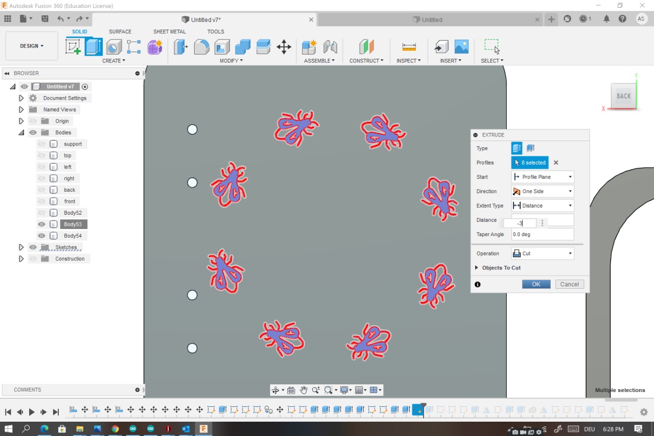 For the front side I had to design the door and the LCD shape I choose to decorate the door with a form of the target insect , these perforations are also from where the insects will enter the trap