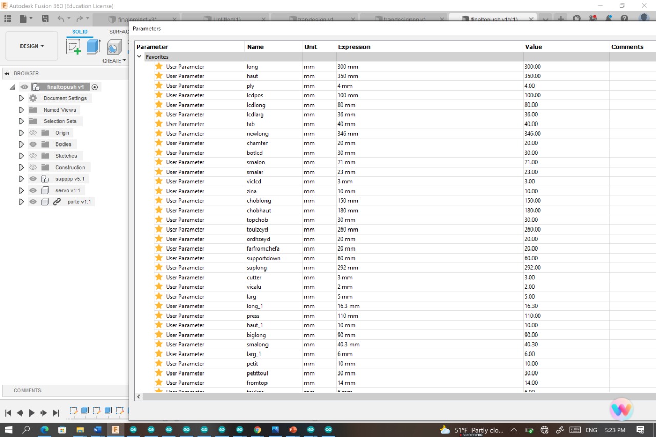 I started by designing the motor and the pusher support I used the MG996 servo motor datasheet to be sure about the dimensions which I should define in the parametres