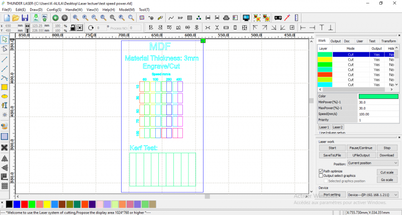 However, this software is definitely not the best to be used, we got some problems while making the test template; the colors options and the number of layers is very limited, and the software can only recognize the lines that are thinner than a DPI-dependent threshold. Though our test template required so many different settings in other words ,many different colors. Thus we had to use multiple colored layers to test different powers and speeds. Therefore we used ADOBE ILLUSTRATOR to make a varity of colors and to set every color with a specific setting of power and speed