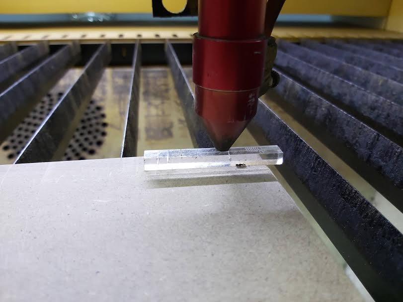 5- Use some material pieces(like a piece of plexiglass) with different sizes to the engraving target to find the correct beam focus point that helps (5mm in our case) to set the machine to a given height above the material.
