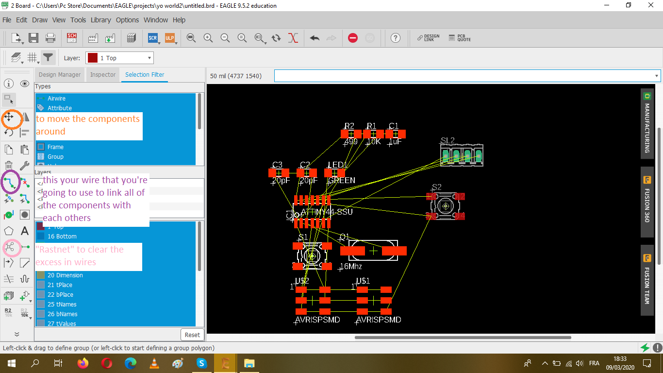Here's where the footprints of Schematic are present and you need to manually arrange all the components in a way that it looks like a puzzle so when routing my wires don't overlap each other.