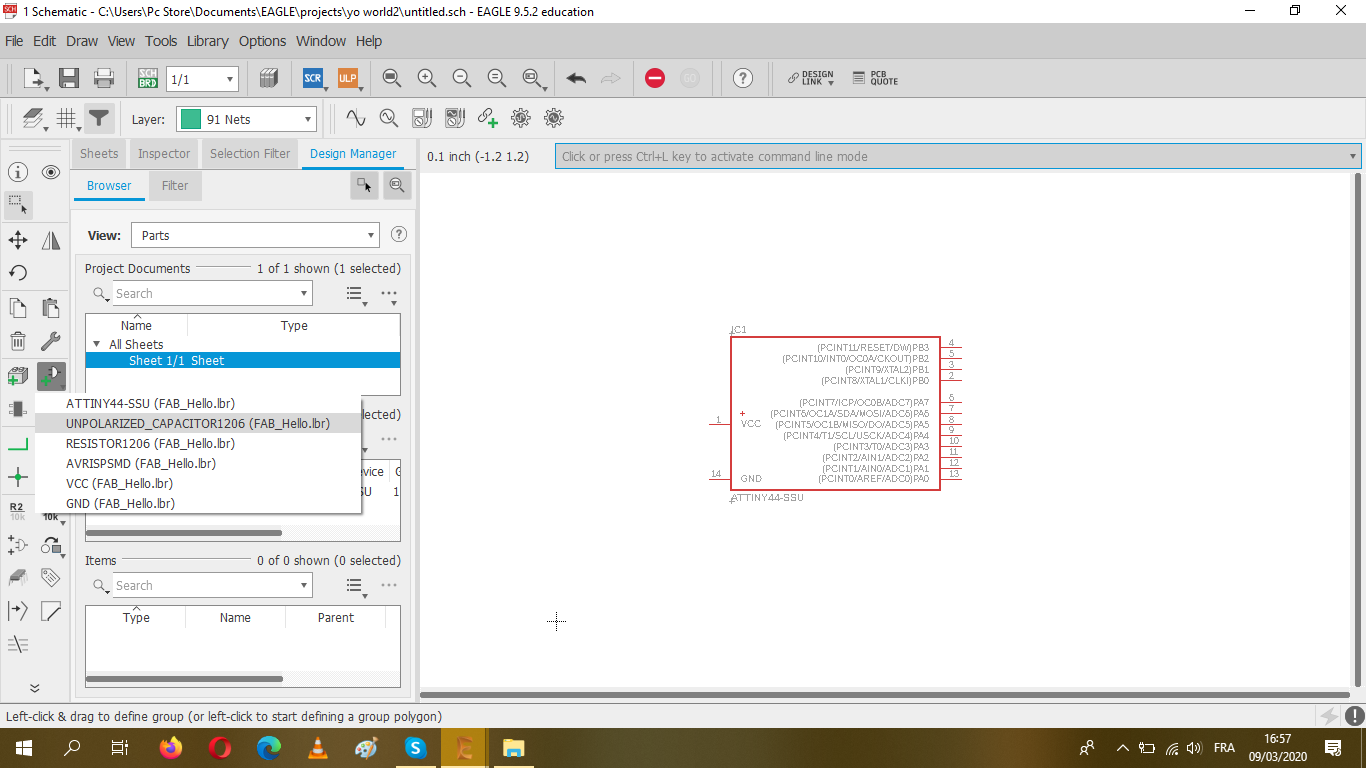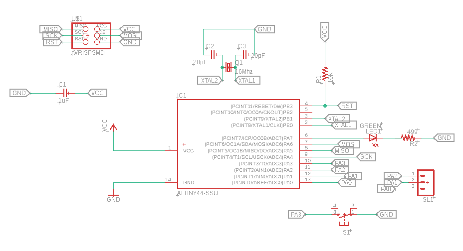 I started with the ATiny44 as the central component in the schema of my circuit, then I started linking it with the rest of the components.