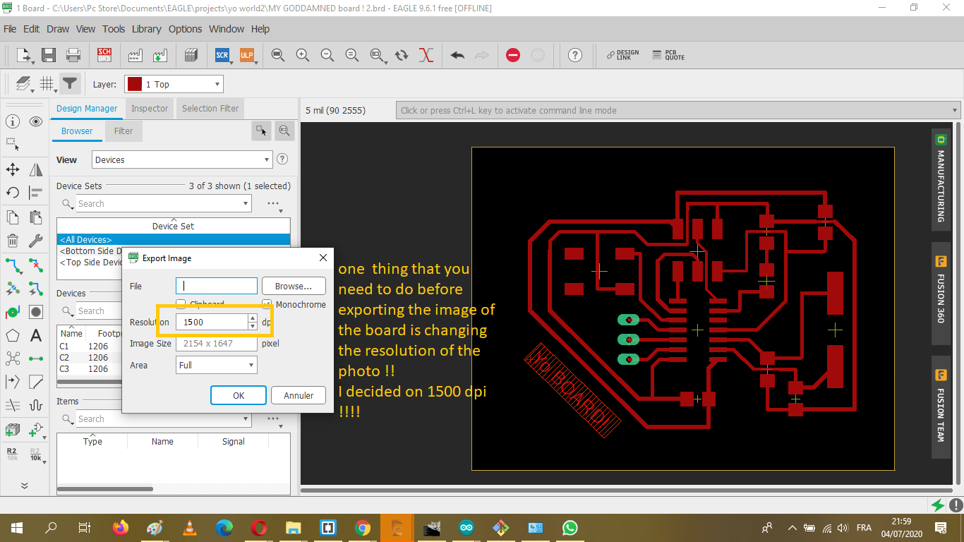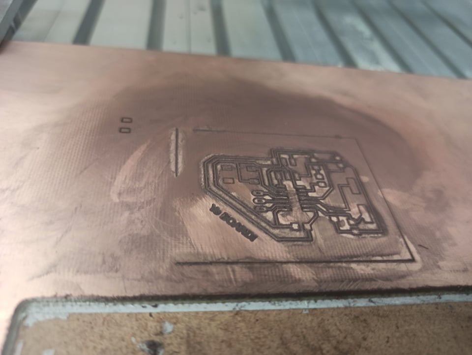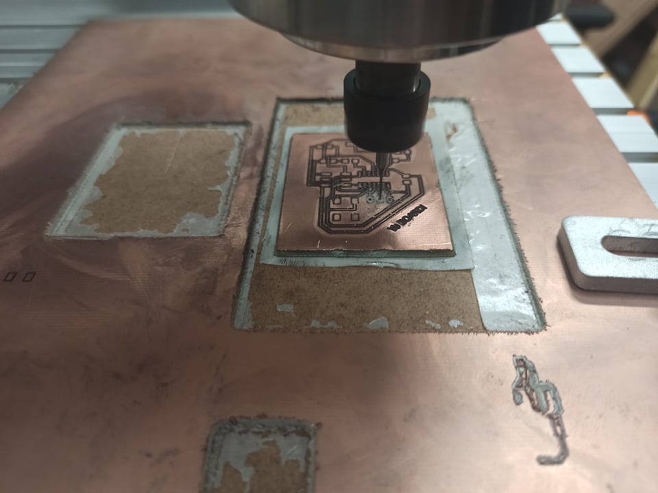 • Not only that , the milling part (despite the fact that we had a serious time coping with the sudden break of Covid-19, so after the end with the shutdown, we had other serious problem, we spend a lot of time fixing the sittings and the finding the perfect tool for the work to end perfectly), so literally we spend alot of time while setting the X,the Y and the Z axis and changing the bits for traces and outlines(this one has to be bigger in size compared to the traces tool ) cutting.
