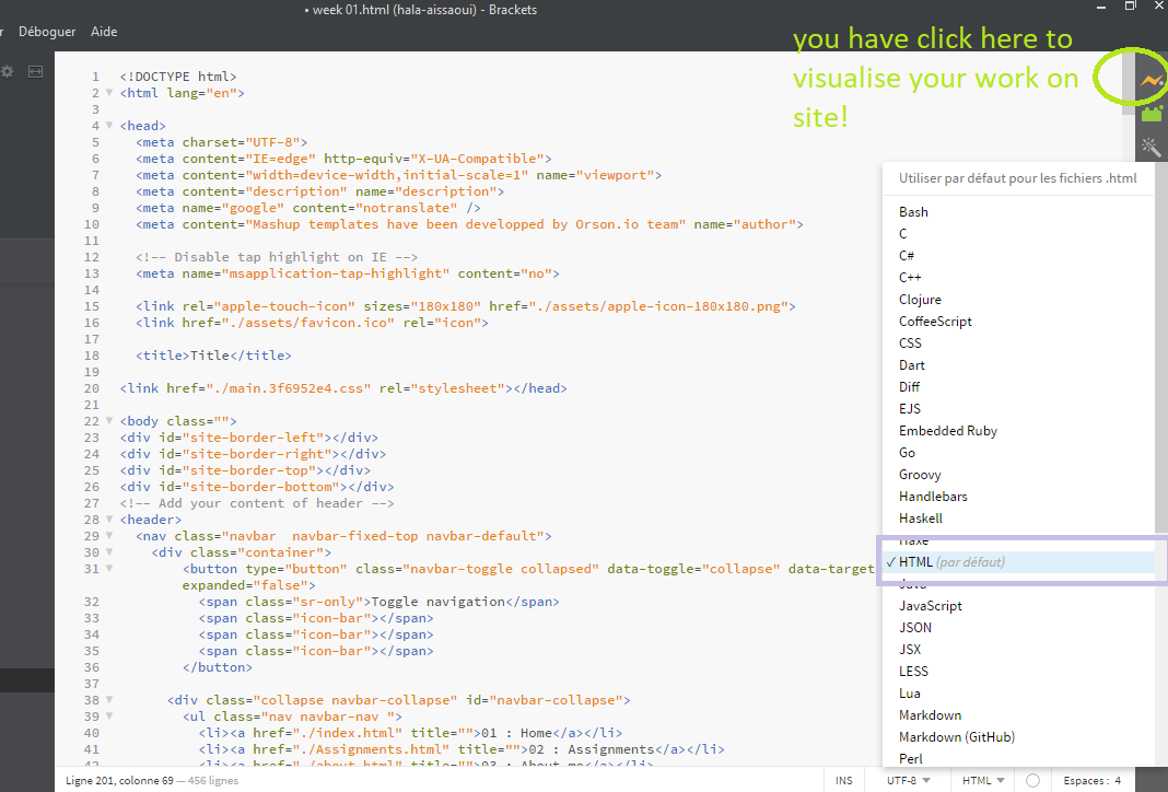 Prepare you working place as a html file and the click on the lightning symbole to visualise the changement