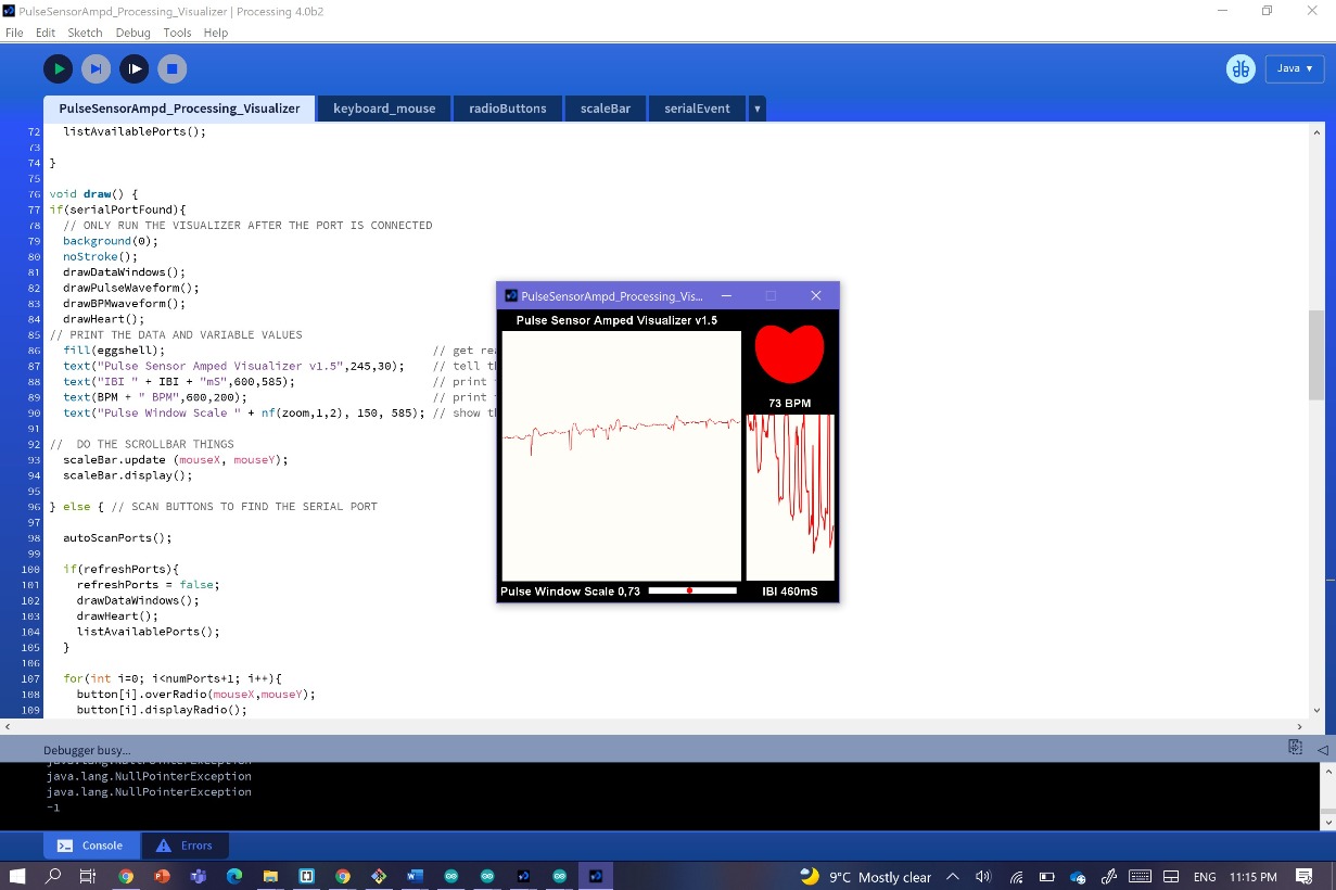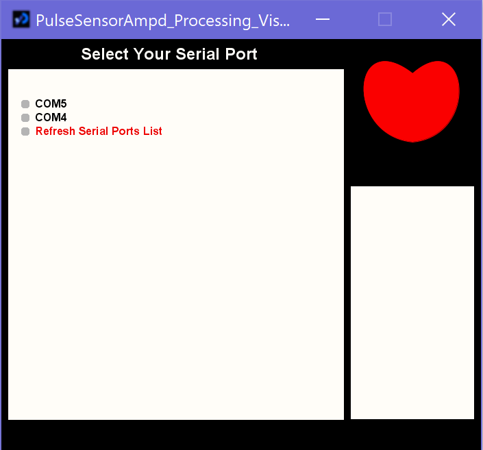 for that I used the pulse reader and made the same wiring and steps, except for the part that I had to download the zipped file from here. Unzip it, and take the folder called PulseSensorAmpd_Processing_Visualizer and place it in the Documents/Processing folder.