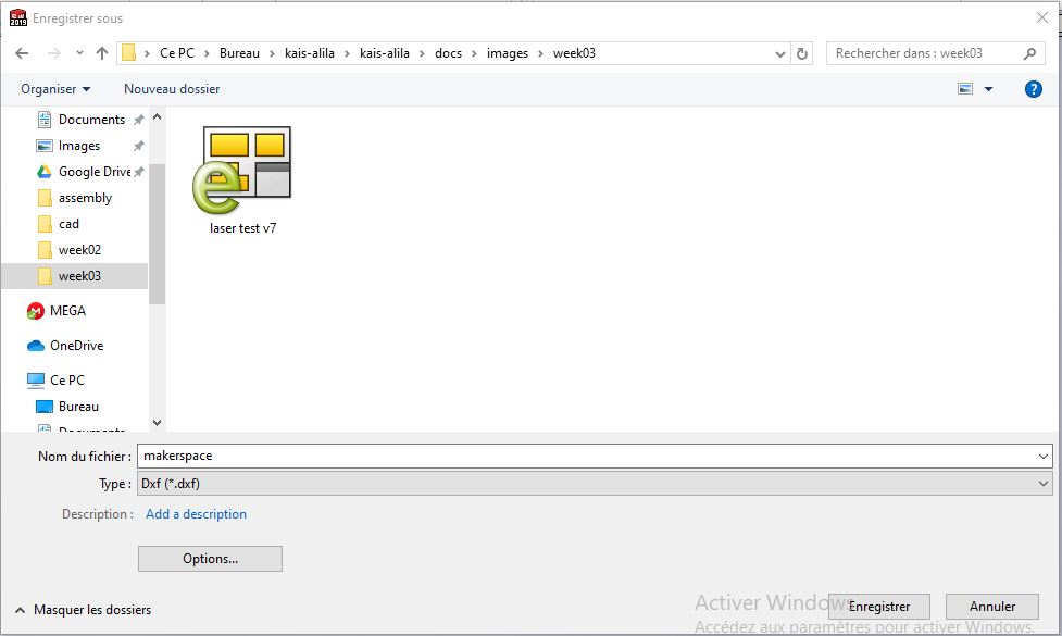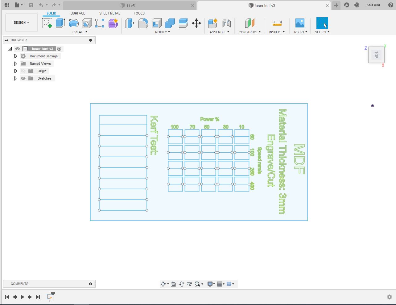 We took inspiration from other open source laser test templates and we made our own template after, we chose to test cutting and engraving at the same time on MDF 3mm with diffrent speed and laser power for each rectangle test (like shown in the previous image). Then export the sketch to DXf format.