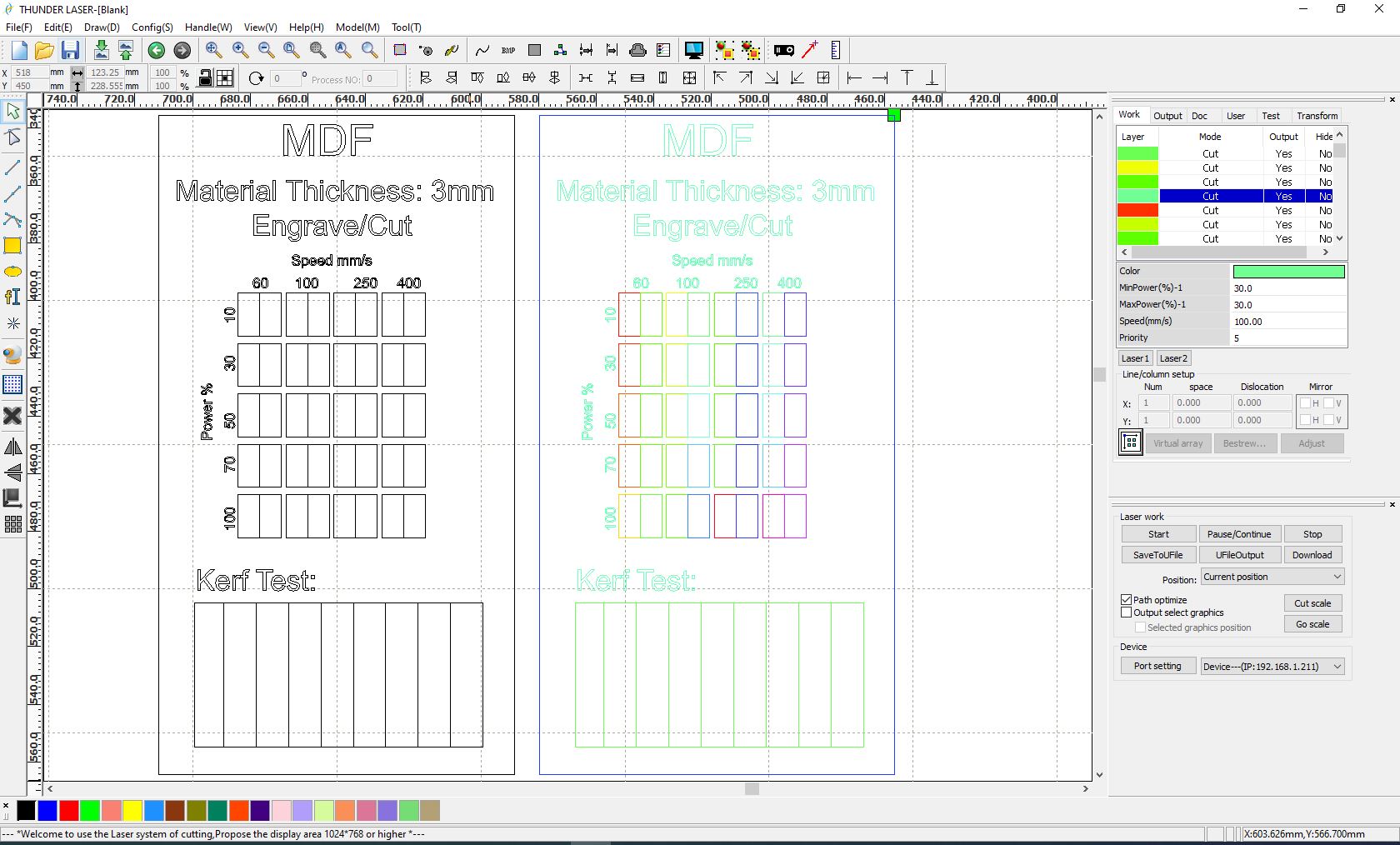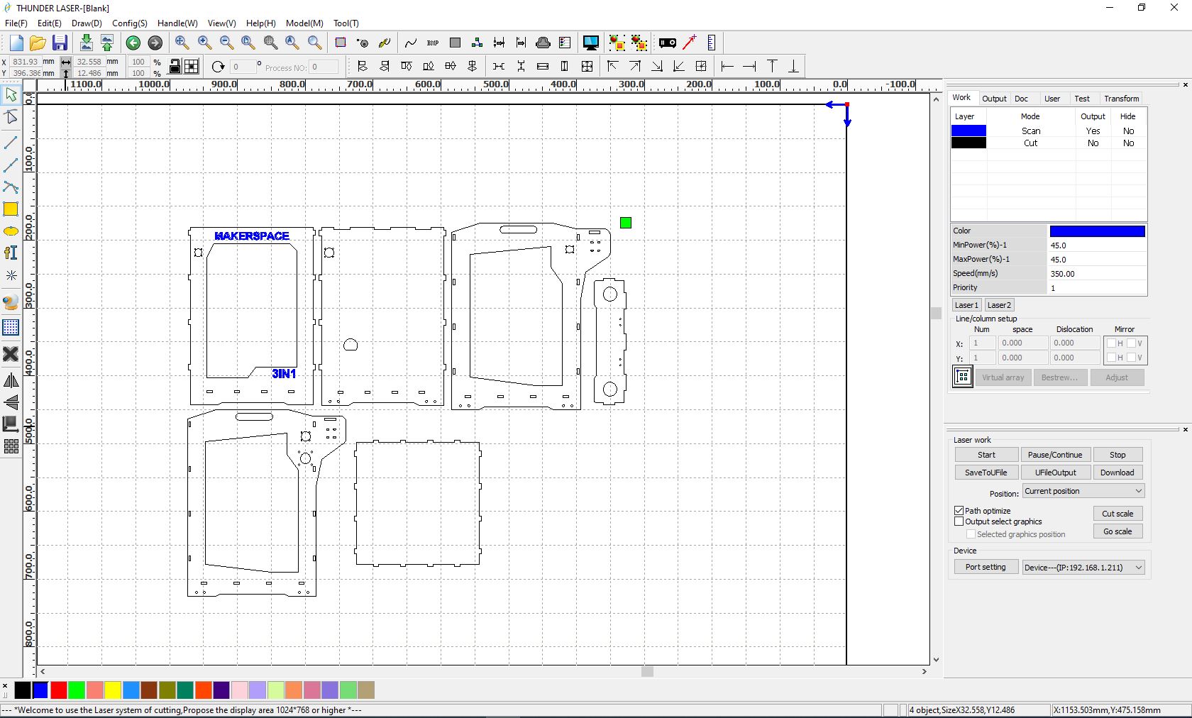 we usually use RDworks or LaserCAD to manage and send the job to the laser. The software can set parameters (setting) like power, speed and frequency per color or for the whole job, but only lines thinner than a dpi-dependent threshold are recognized to be cut. Since our template required so many different settings, we had to use multiple colored layers to stack all the power settings. RDworks has a limited number of layers and so it became very time consuming to cut even one template. (Import dxf file to the software)