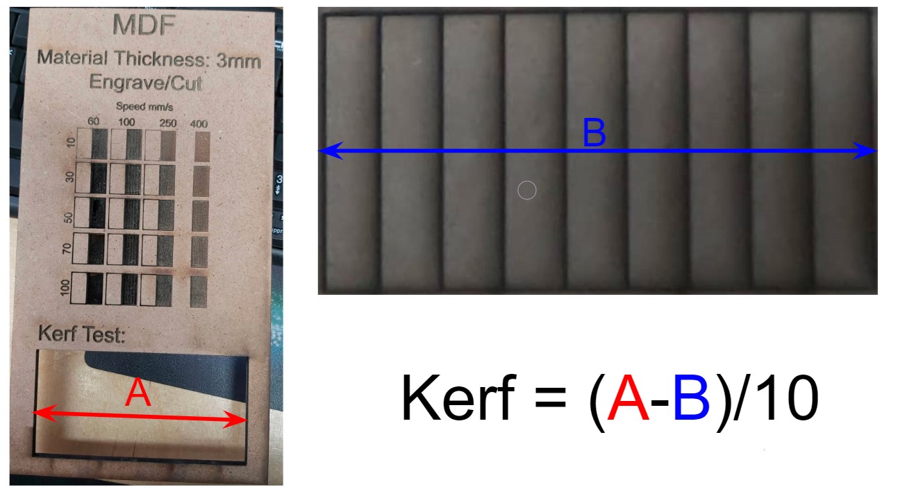 Dividing this gap by ten gives the average kerf for that material and material thickness. In the our case we’ve obtained a 0.3mm kerf for plywood with 3mm thickness.