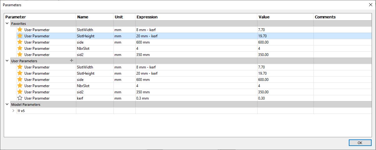 I used Fusion 360 in parametric design, the frame of the machine was designed to be assembled like puzzle so I added some parameters on the frame. The first step was to add parameters:
