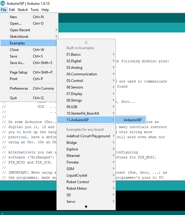 Then open the arduino frameware and run the ArduinoIsp program , to find it you should go to file ->example ->Arduino ISP and it will transfer the arduino into prgrammer.