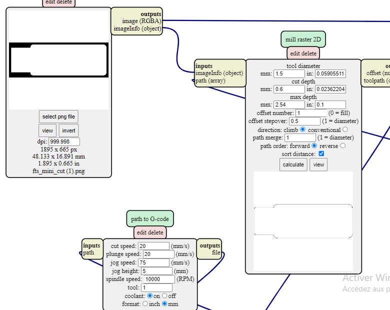 For the cut settings, after many tests and researchs we found these settings: 4 mm/s as cut speed, 2 mm/s as plunge speed, 75 mm/s for jog speed and 5 mm for jog height. the spinle speed is 10000 Rpm.