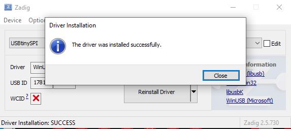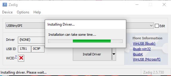 After that you should install the driver for the fabisp to be recognized with the computer using Zadig software. search for USPtinySPI and click on Install Driver.