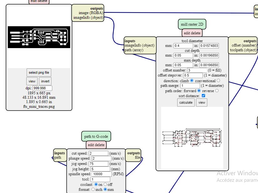 In our fablab we usually use FatCAM as post prcessor to generate the G-code. Down bellow all the steps documented for the fablab members in How to use the CNC for PCBs using FlatCAM?
