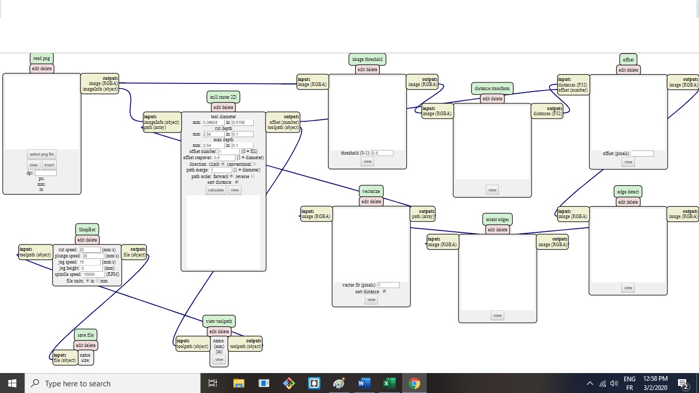 For this week’s group assignment we had to characterize the specifications of our PCB production process on our CNC 3040. The software that we used for milling was Fab Modules, online at Mods and send nc files trough Mach3 software sender.